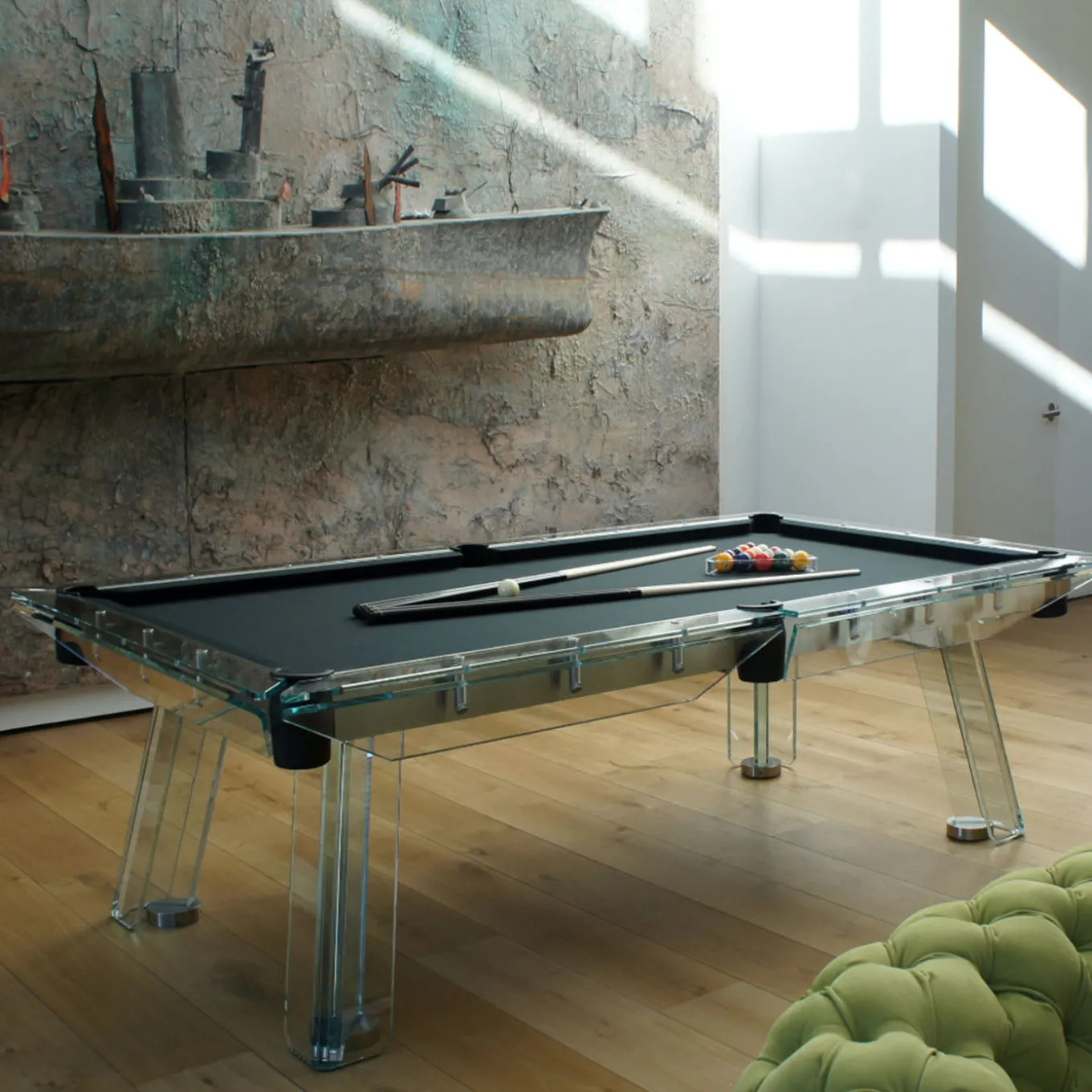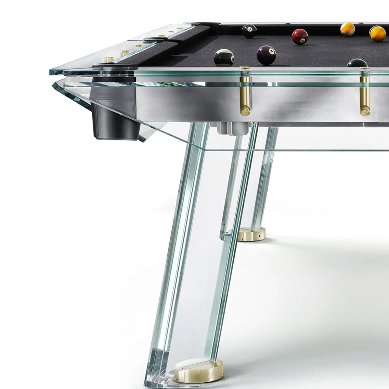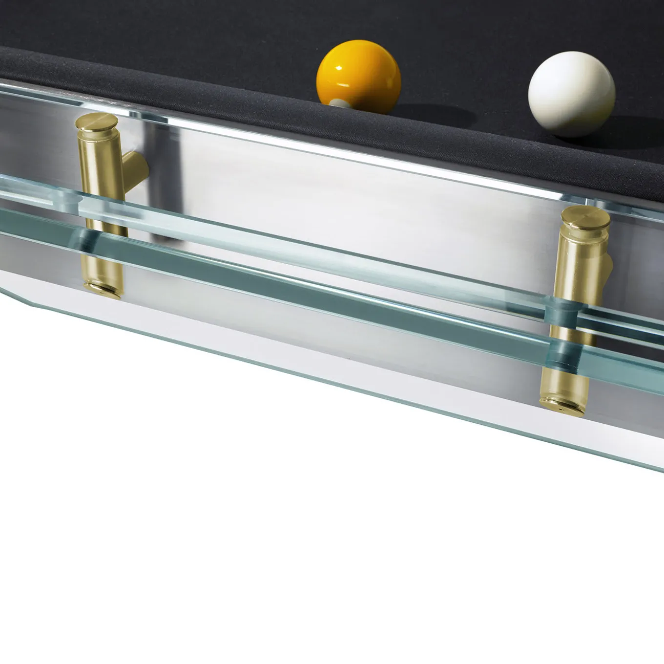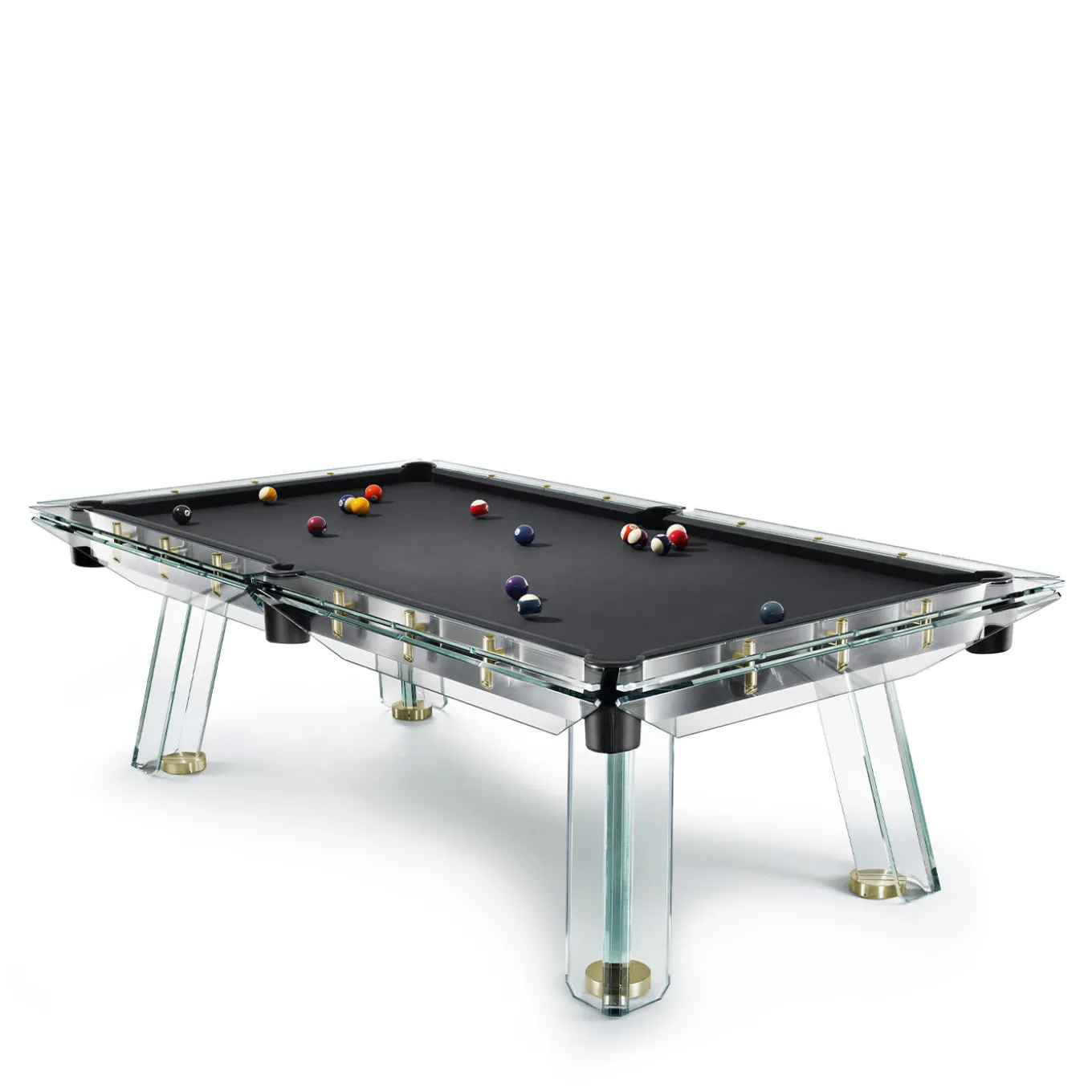 Il Filotto è il classico gioco del biliardo, emblema del tempo libero originario dei palazzi borghesi, diventato poi uno sport popolare attraverso le generazioni. La magia del tavolo risiede nella sottile struttura in acciaio, regolabile e divisibile, che sostiene il piano di gioco in ardesia, e nella struttura in cristallo che caratterizza il nuovo design. Gli esclusivi dettagli in oro 24k esaltano ulteriormente la preziosità e l’originalità di questo pezzo. La sensazione unica di vedere il biliardo “galleggiare” su quattro gambe è complementare al piacere di giocare su questo capolavoro italiano. 1 set di palle da biliardo professionali e 4 stecche da biliardo incluse.