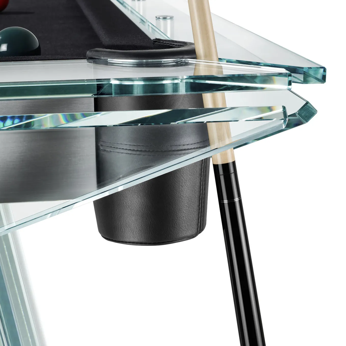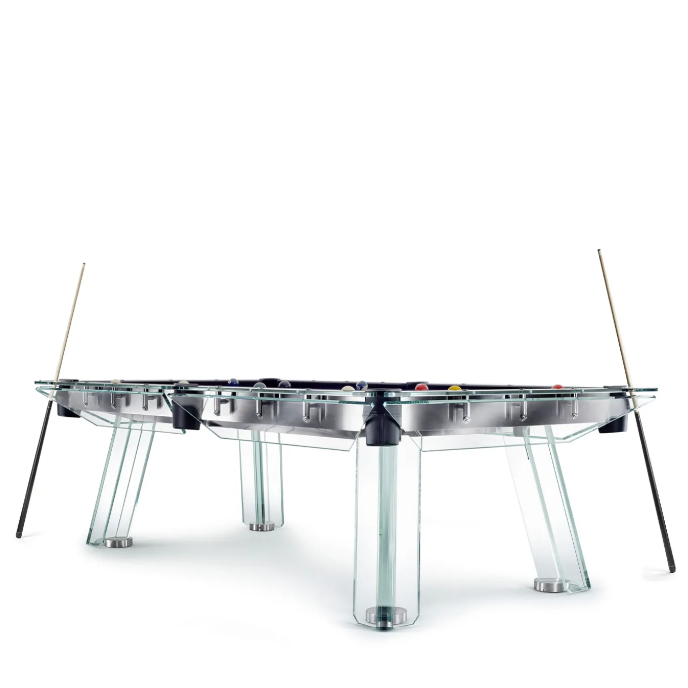 Filotto dà nuova vita, caratteristiche e valori al classico tavolo da biliardo. Il suo design, la sua costruzione e la sua lavorazione sono tutti italiani e rappresentano la massima espressione della sofisticazione tecnologica e della maestria artigianale che da sempre distinguono l’Italia dal resto del mondo. Il suo piano sembra fluttuare a mezz’aria grazie alle gambe trasparenti e cristalline. Sono inclusi quattro bastoni, un set di palle da biliardo professionali con scatola in pelle e un porta triangoli in pelle.