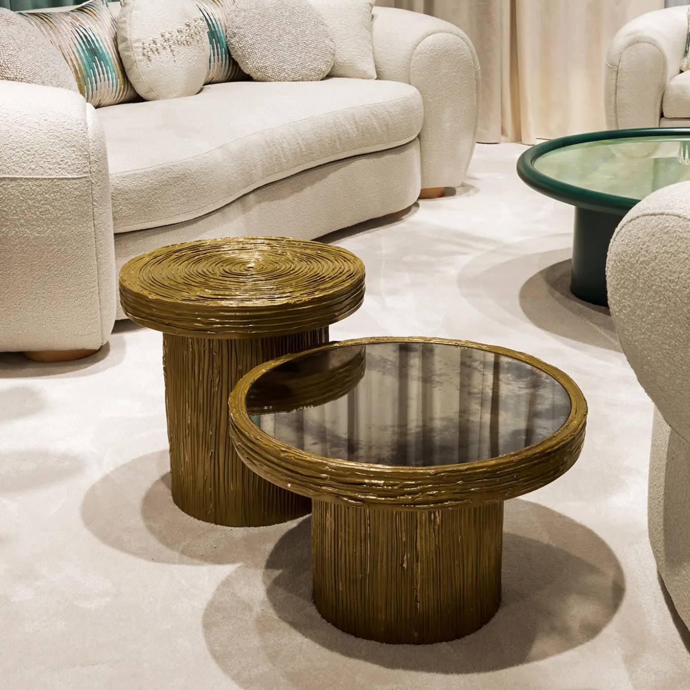 Tavolino rotondo in legno fatto a mano, decorato con gesso e metallo liquido dorato. Può essere perfettamente abbinato al tavolino Aura Mirror.
