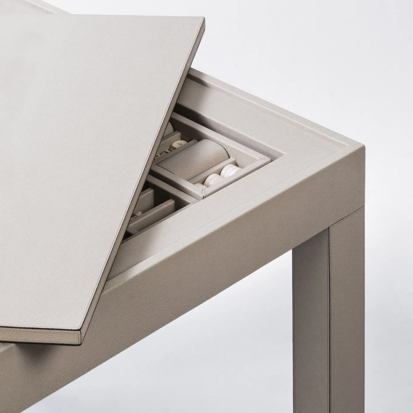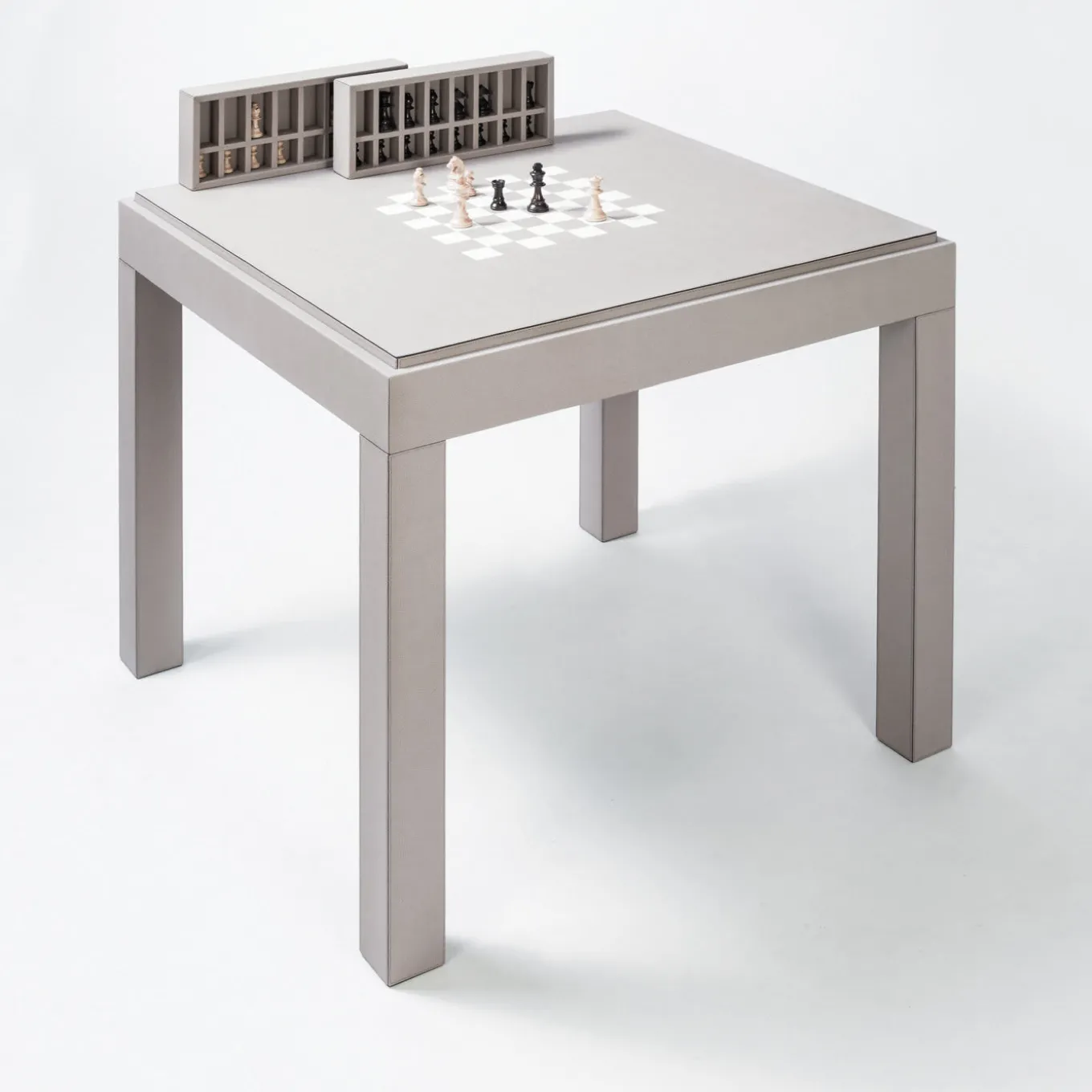 Questo splendido tavolo è la superficie ideale per giocare a backgammon, scacchi e dama con stile. La struttura in legno è rivestita in pelle e presenta gambe rimovibili, in modo da poter utilizzare entrambi i lati del piano smussato: un campo da backgammon con intarsi in pelle su un lato e una scacchiera intarsiata sull’altro. Sotto il piano, tre vassoi rivestiti in pelle con scomparti consentono di riporre le pedine degli scacchi in legno di bosso, le pedine del backgammon in acero e noce con inserti in pelle, due coppe per i dadi, dadi standard e un cubo per il raddoppio.