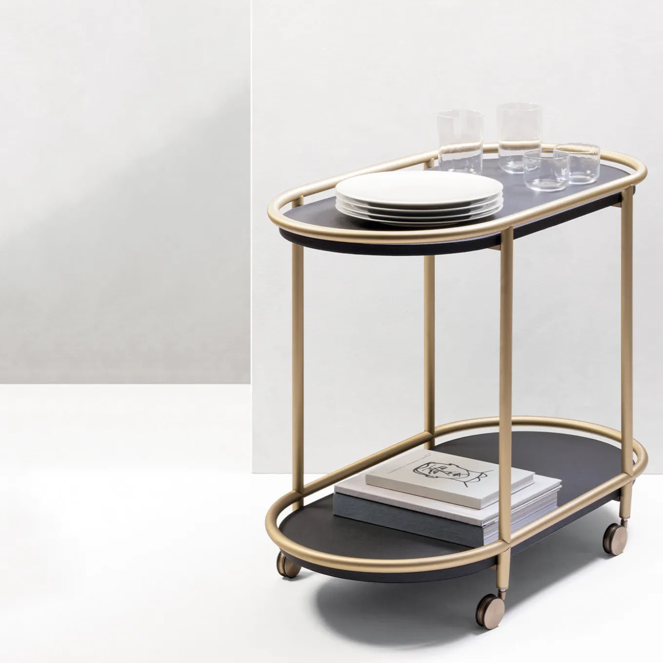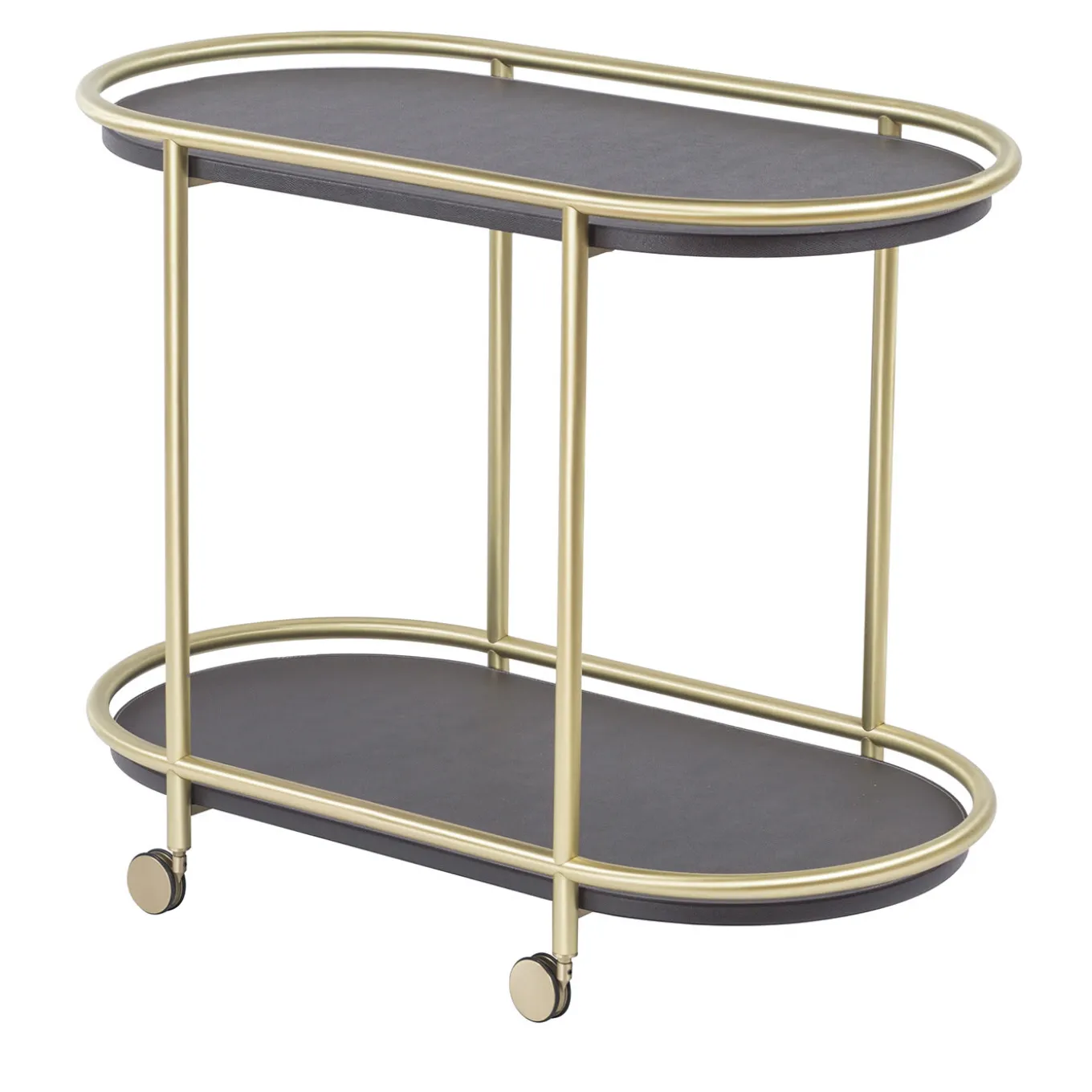 Il glamour è servito! Interamente rivestito in nappa nera, questo tavolo presenta due ripiani ovali messi in mostra da una struttura tubolare in ottone satinato, dotata di rotelle che consentono una grande mobilità. Progettato per servire cibi e bevande, questo splendido tavolo può essere utilizzato anche come espositore per piante e oggetti da collezione in un soggiorno, uno studio o una camera da letto. Contattare il Concierge per altre finiture disponibili.