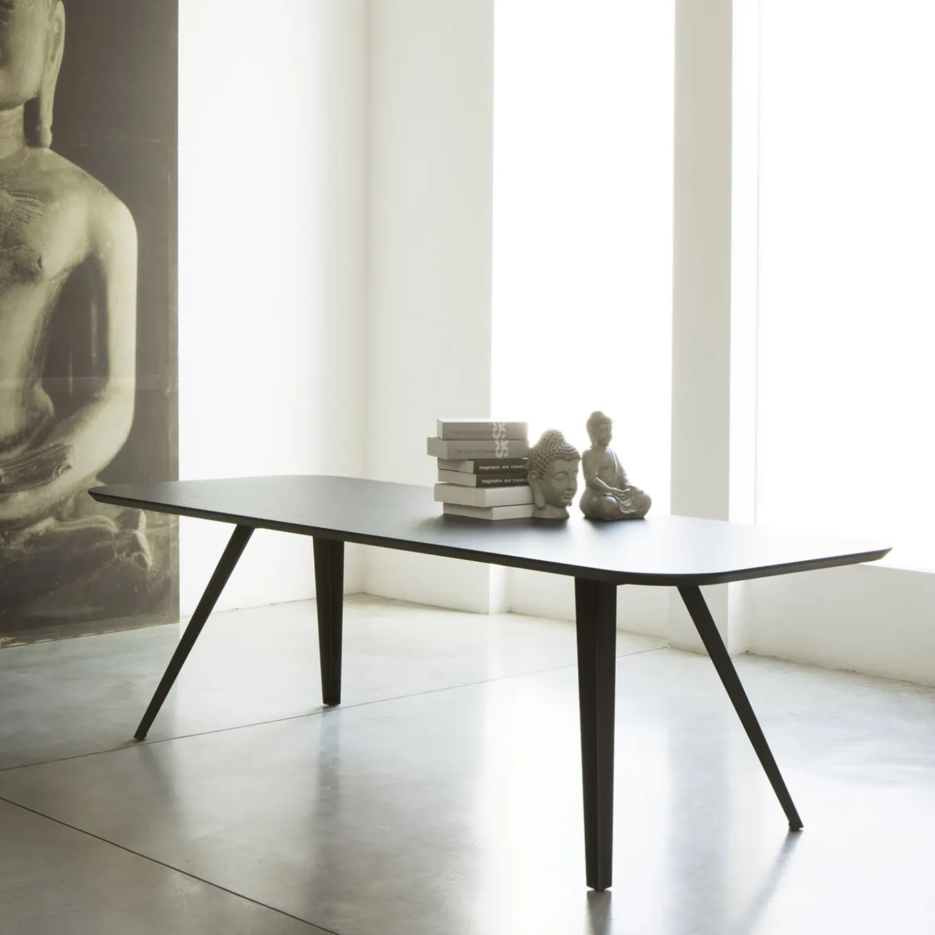 Testimonianza di un design minimalista, questo tavolo da pranzo è caratterizzato da una silhouette unica composta da quattro gambe inclinate in metallo che ricordano le postazioni di lavoro degli artigiani e da un ampio piano in MDF di frassino-venere con finitura nera a poro aperto. Disponibile anche nei toni naturali del frassino, frassino sbiancato o tinto cacao, la collezione Amy Met offre opzioni versatili con piani quadrati, rotondi e rettangolari.