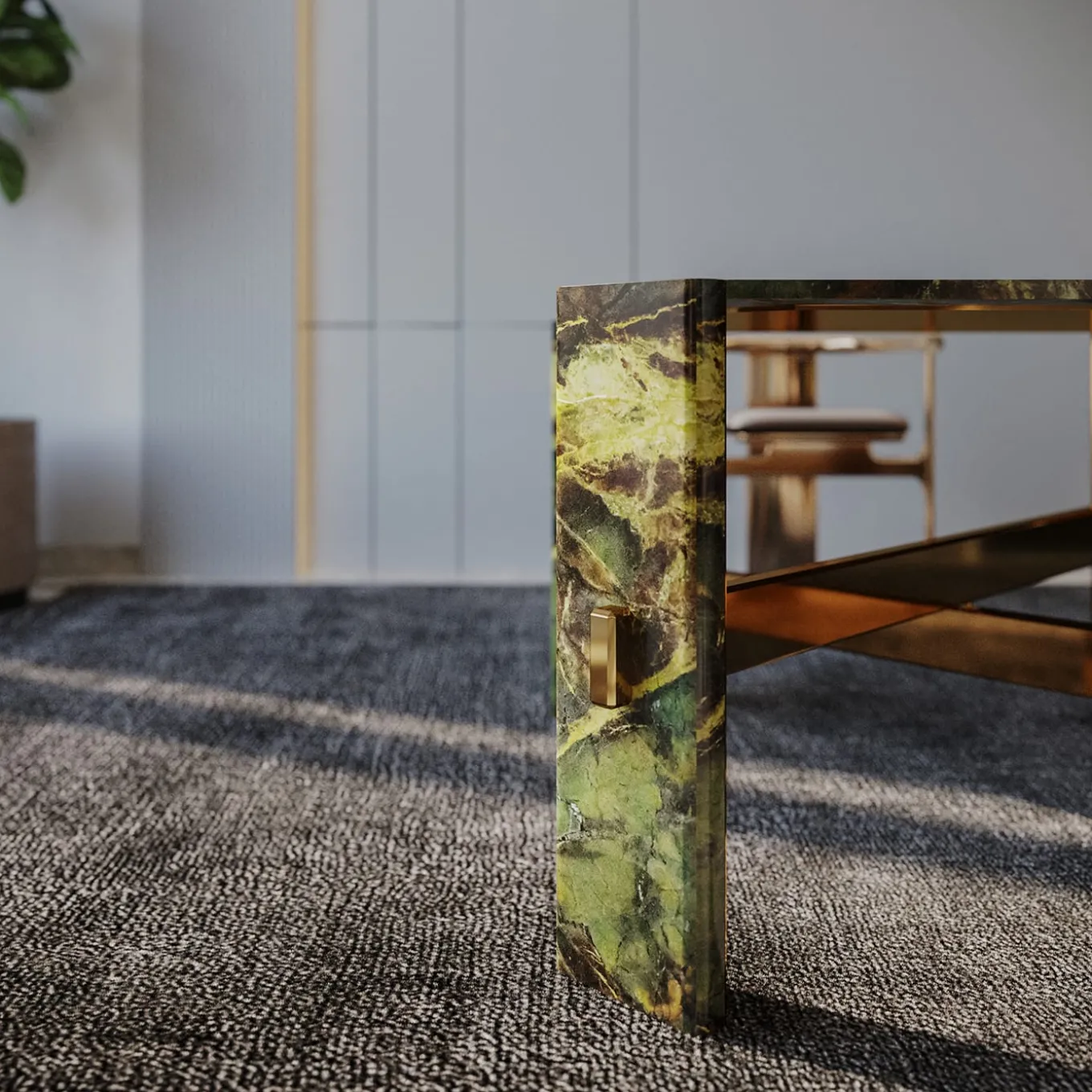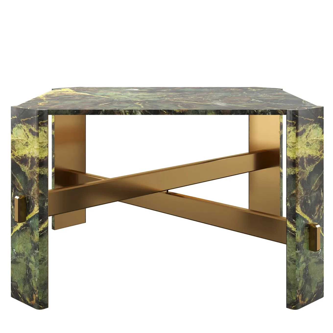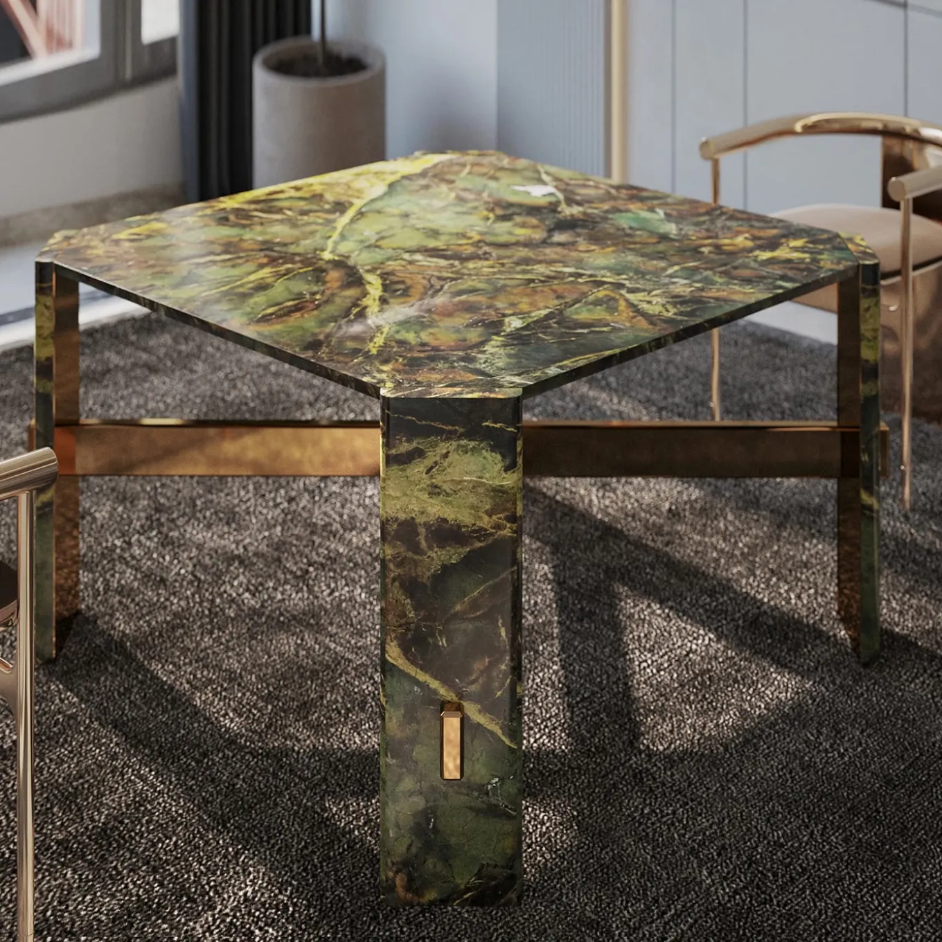 Questo tavolo da pranzo è caratterizzato da forme scultoree e geometriche, che lo rendono un pezzo forte in qualsiasi spazio. Interamente realizzato in marmo Verde Borgogna, il tavolo è composto da un piano quadrato sostenuto agli angoli da quattro gambe sagomate. Ogni gamba è rivestita in marmo Verde Borgogna nella parte anteriore e in metallo con finitura bronzo lucido nella parte posteriore. Due travi strutturali in metallo che si sovrappongono tengono insieme il tavolo. Si prega di contattare il Concierge per le opzioni di personalizzazione. A causa della natura del materiale, il prodotto può variare leggermente.