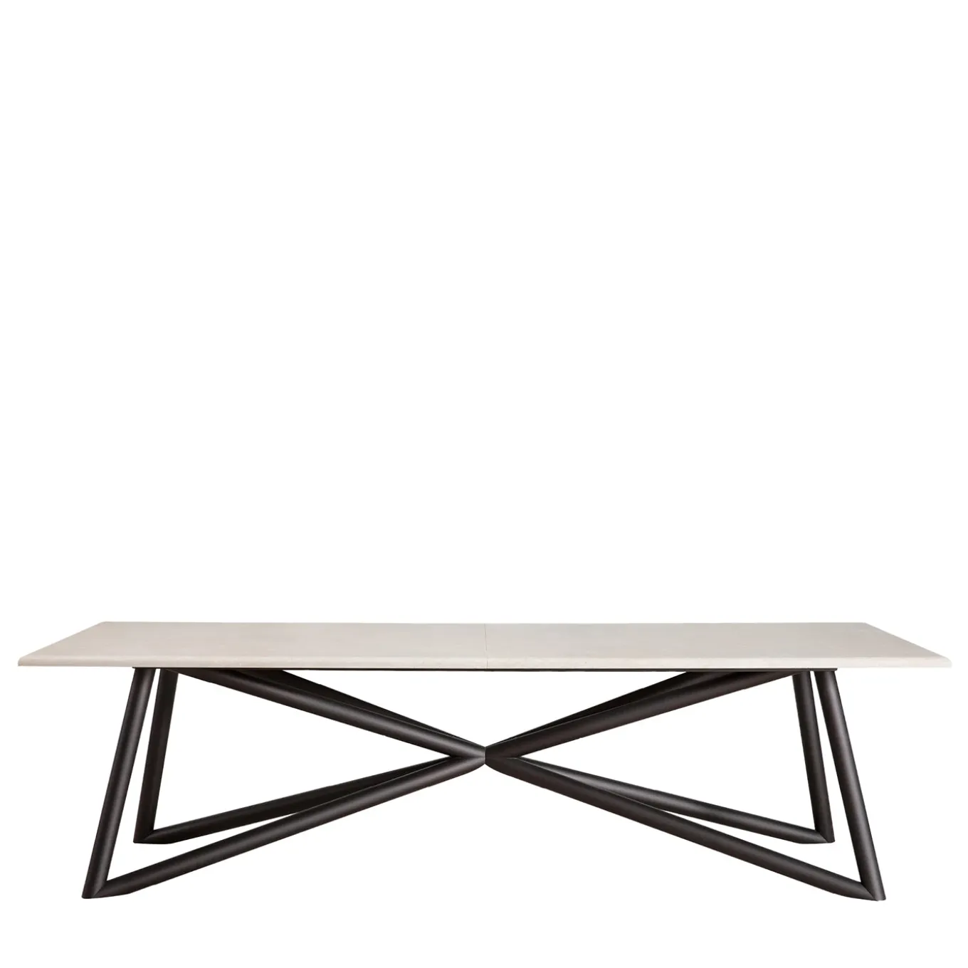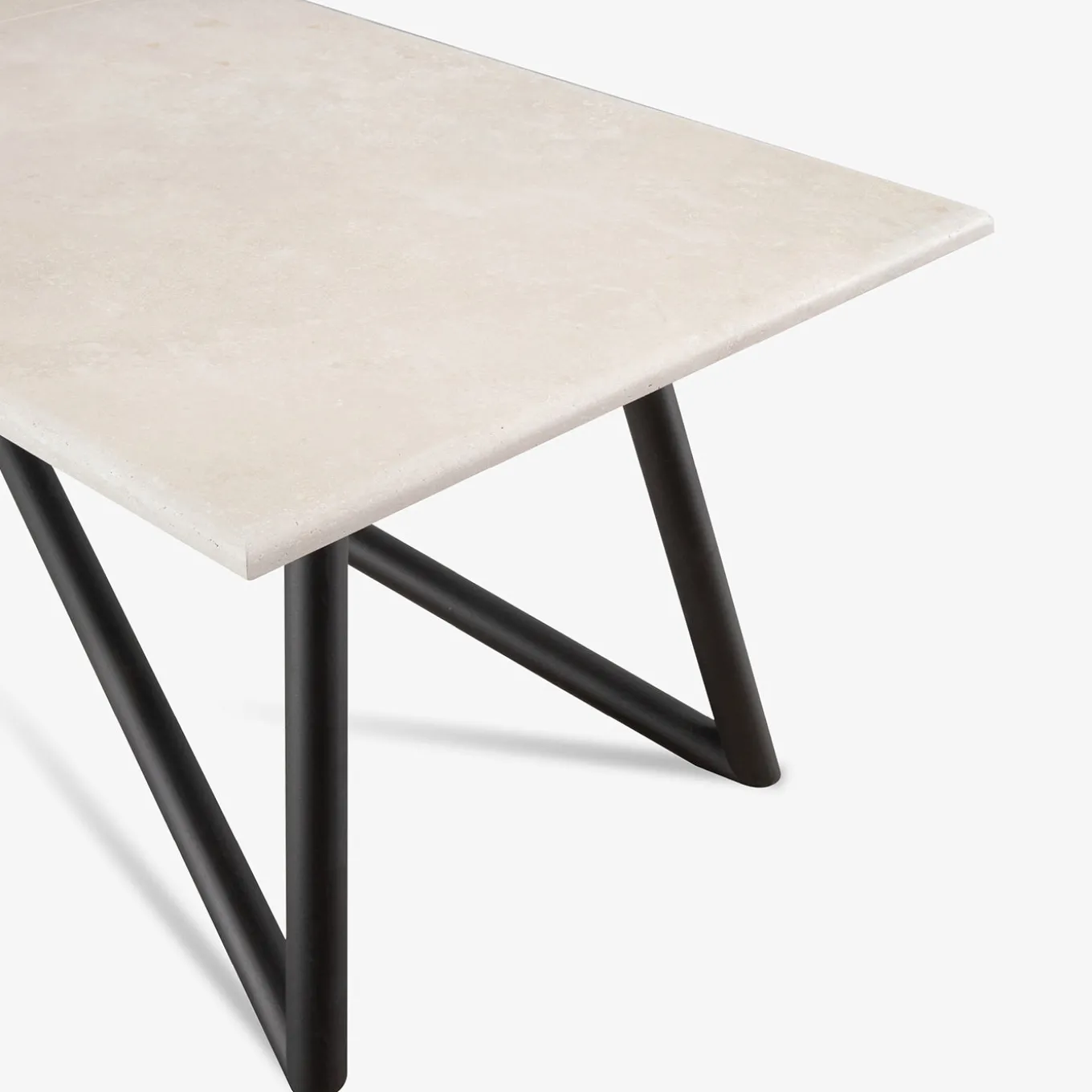Il tavolo Larte presenta un piano rettangolare composto da due elementi in travertino levigato, trattati per resistere a macchie e agenti atmosferici. La base scultorea, realizzata con tubi in acciaio zincato intrecciati, è rifinita in marrone scuro con polveri termoindurenti, garantendo durabilità e resistenza all’uso esterno. I bordi arrotondati e la lavorazione di precisione, ottenuta tramite avanzate tecnologie CNC, esprimono un perfetto equilibrio tra la pietra senza tempo e una struttura dal design contemporaneo.
