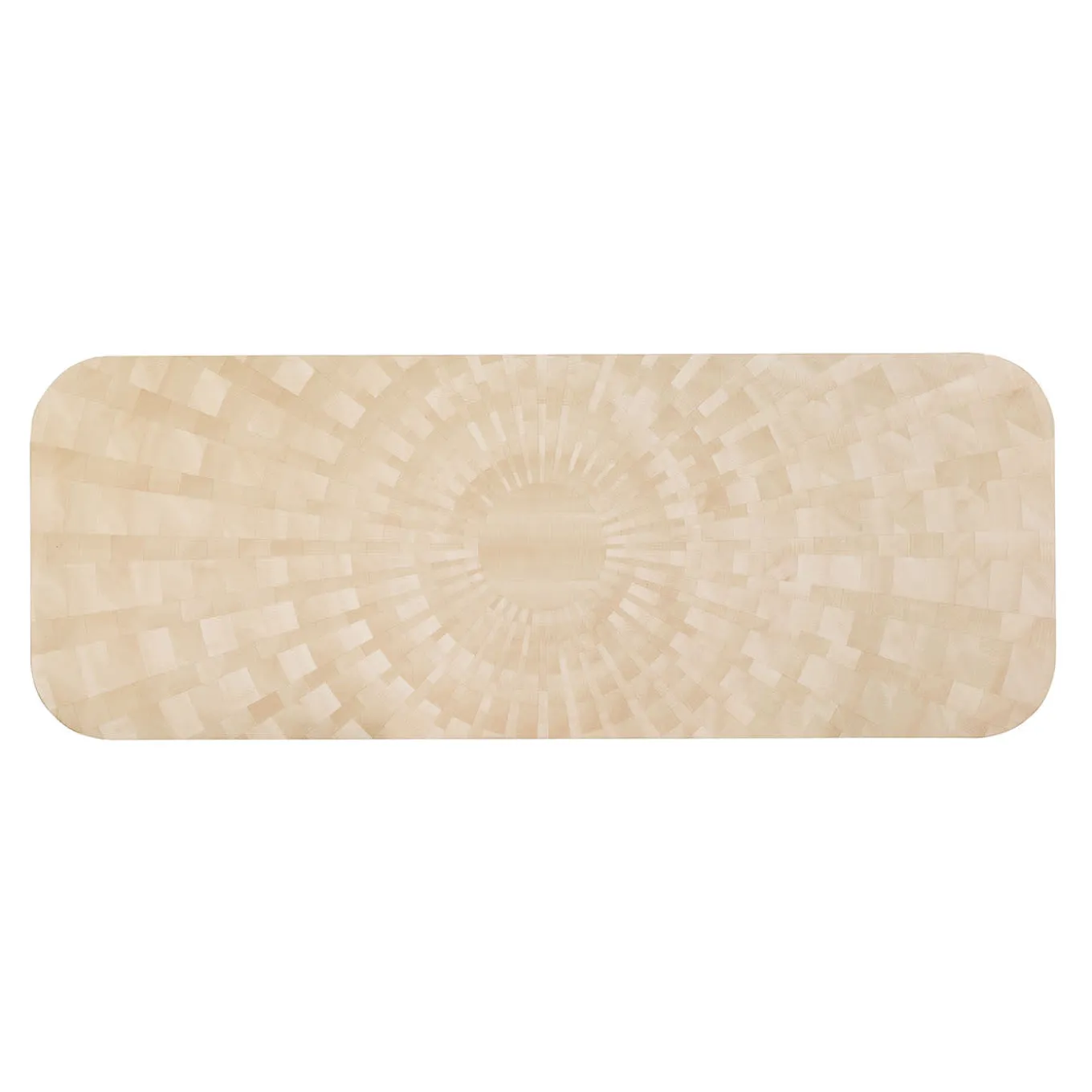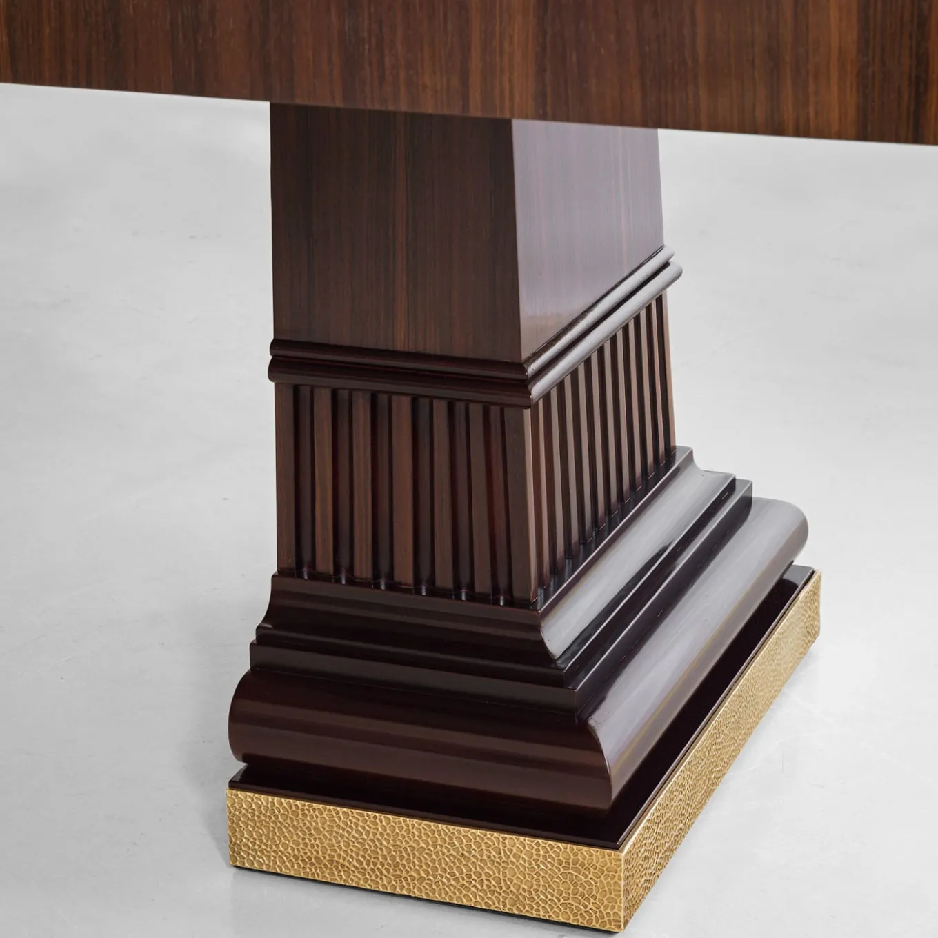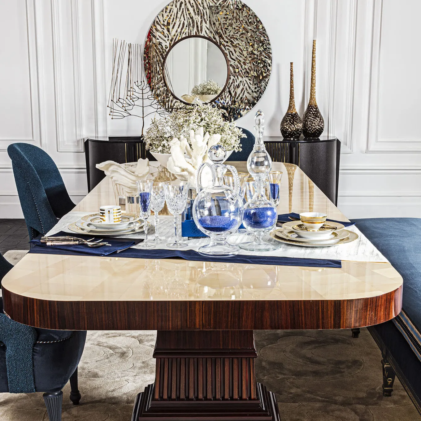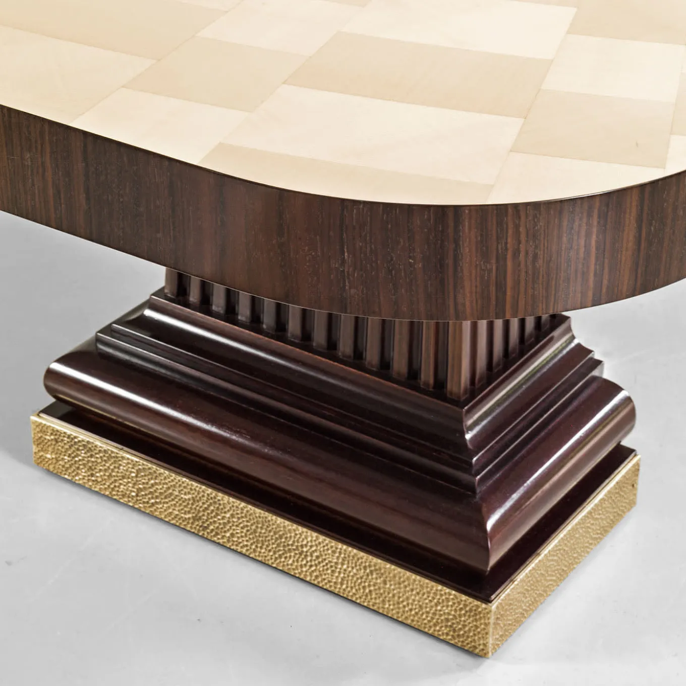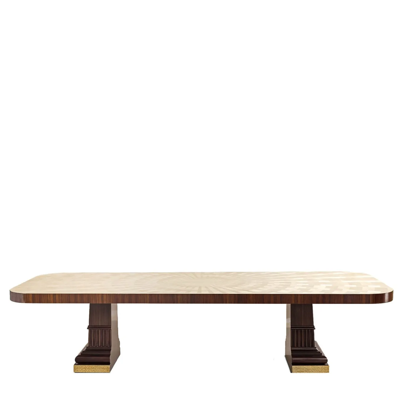 Tavolo da pranzo con piano in acero naturale intarsiato e piedistalli in palissandro e mogano massiccio.