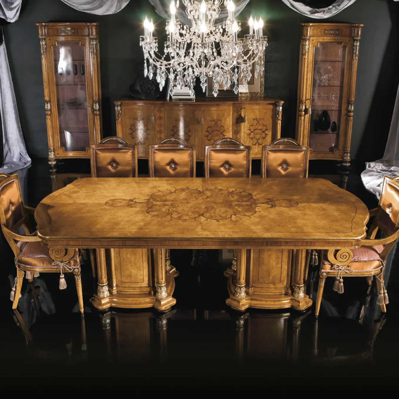 Il fascino del frassino piumato, della radica di noce e del palissandro, uniti all’abile maestria artigianale, definiscono la personalità opulenta di questo tavolo da pranzo. L’imponente piano, riccamente decorato con intarsi fantasiosi e distintivi, presenta linee morbide che anticipano le delicate curve dei dettagli intagliati rivestiti in foglia d’oro che ornano le due basi scultoree con elementi strutturali a colonna.