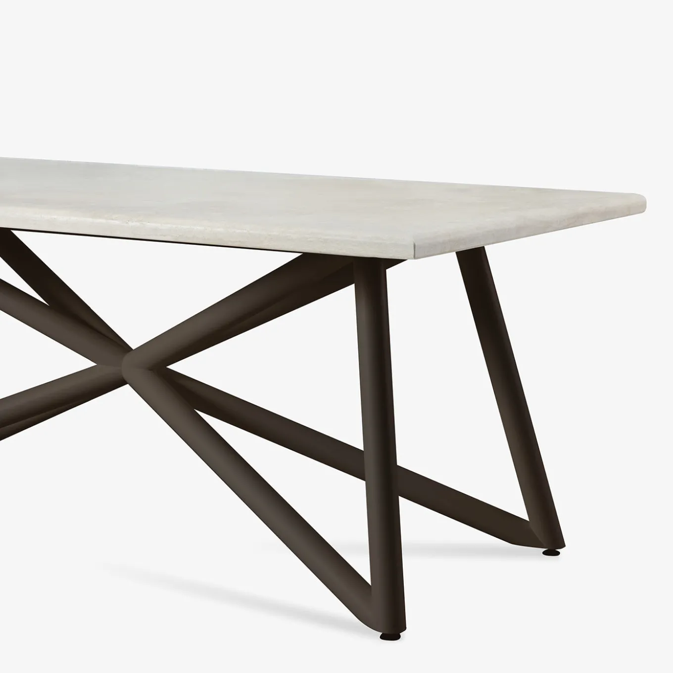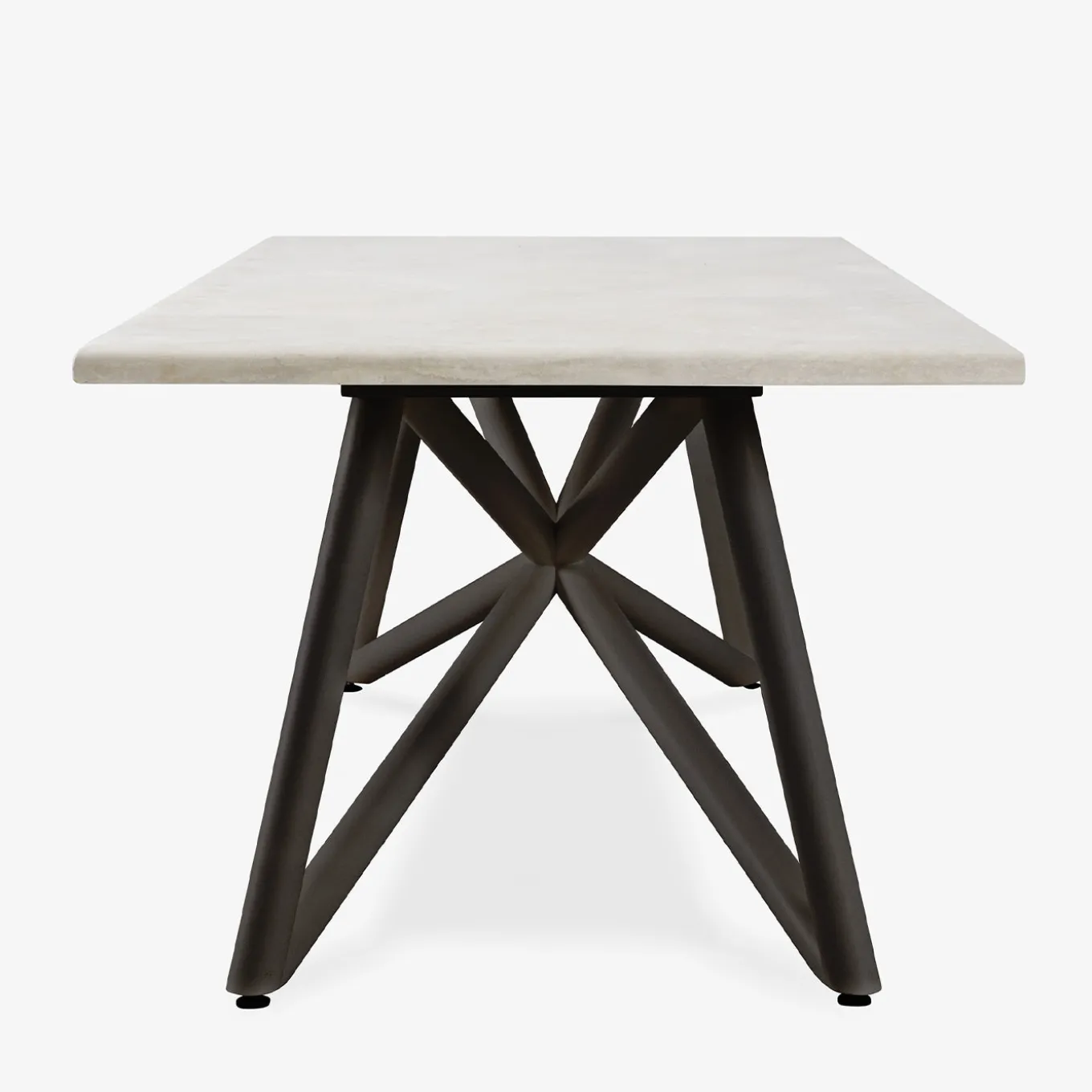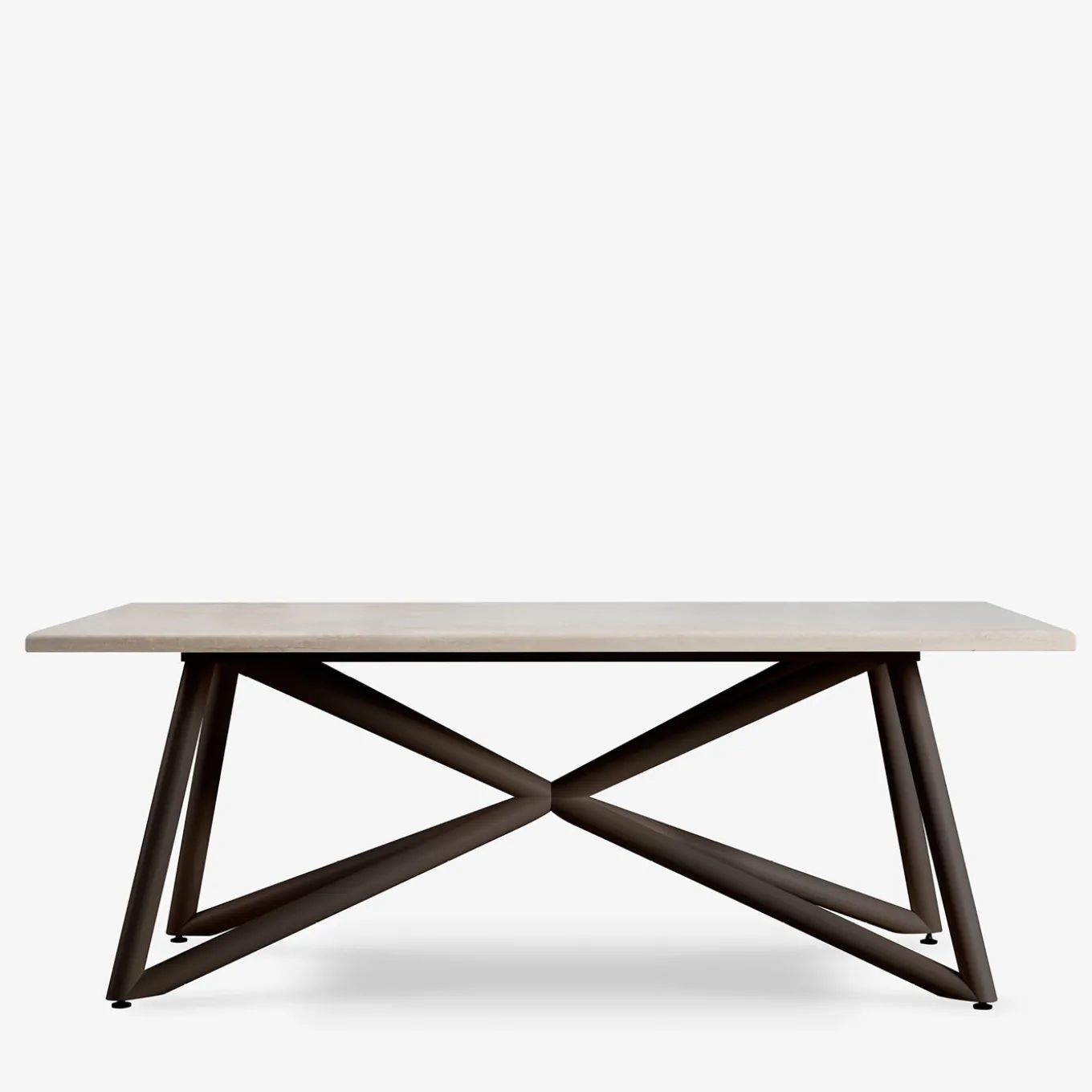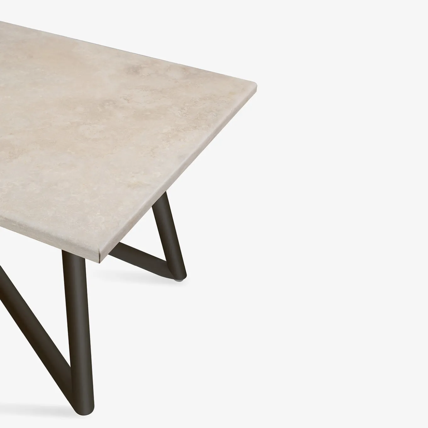Il tavolo Larte presenta un unico piano rettangolare realizzato in pietra calcarea travertino, con superficie stuccata e levigata, trattata per resistere a macchie e agenti atmosferici. La base è composta da tubi intrecciati in acciaio zincato, rifiniti in marrone scuro con verniciatura a polvere termoindurente, pensata per garantire durata e resistenza all’esterno. I bordi arrotondati e la lavorazione di precisione, ottenuta tramite avanzate tecnologie di taglio e saldatura CNC, evidenziano la perfetta combinazione tra eleganza naturale e design contemporaneo.