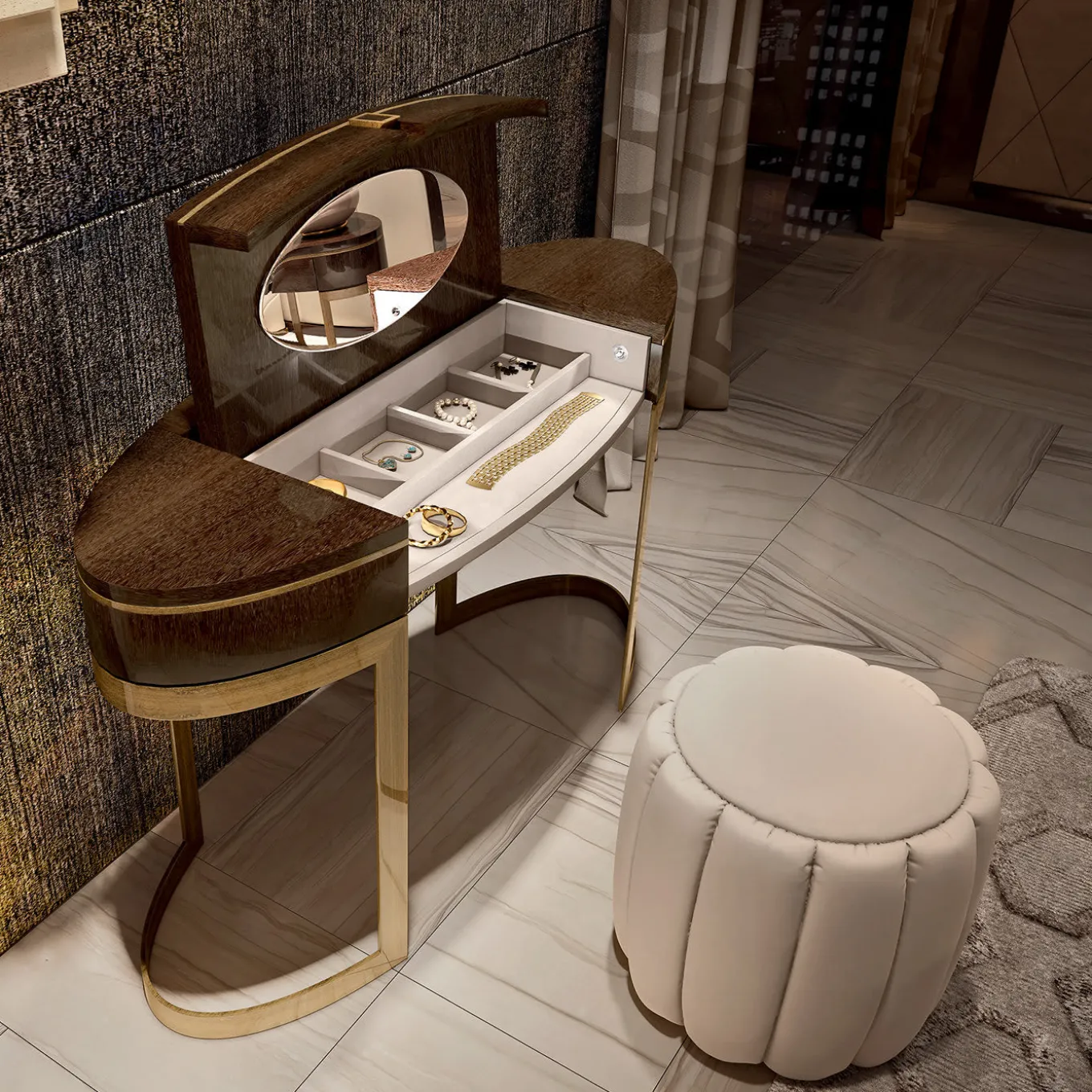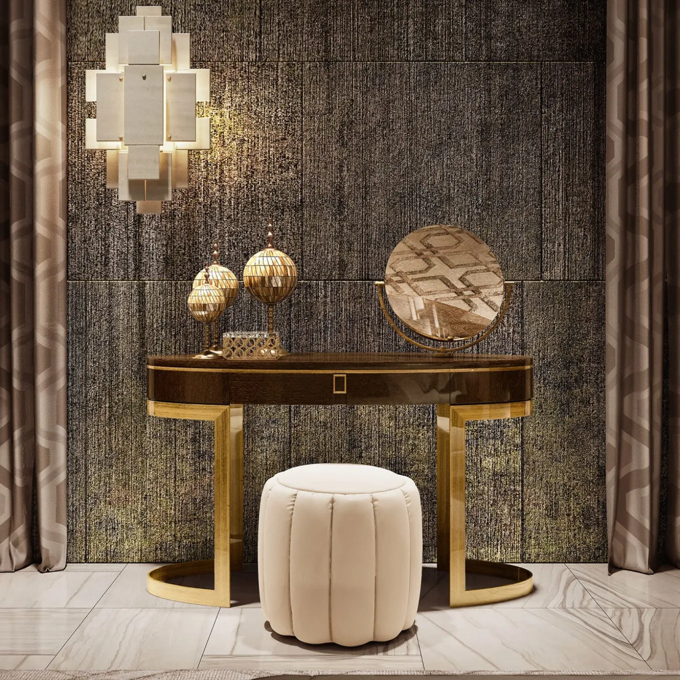 Coccolare, curare la propria pelle o applicare e rimuovere il trucco può diventare ancora più elegante se fatto davanti a questo splendido tavolo da toilette in legno. Il tavolo poggia su una struttura arrotondata in bronzo spazzolato, mentre uno specchio rotondo integrato e un cassetto rendono questo pezzo pratico e bello da vedere. Un’aggiunta perfetta per qualsiasi camera da letto.