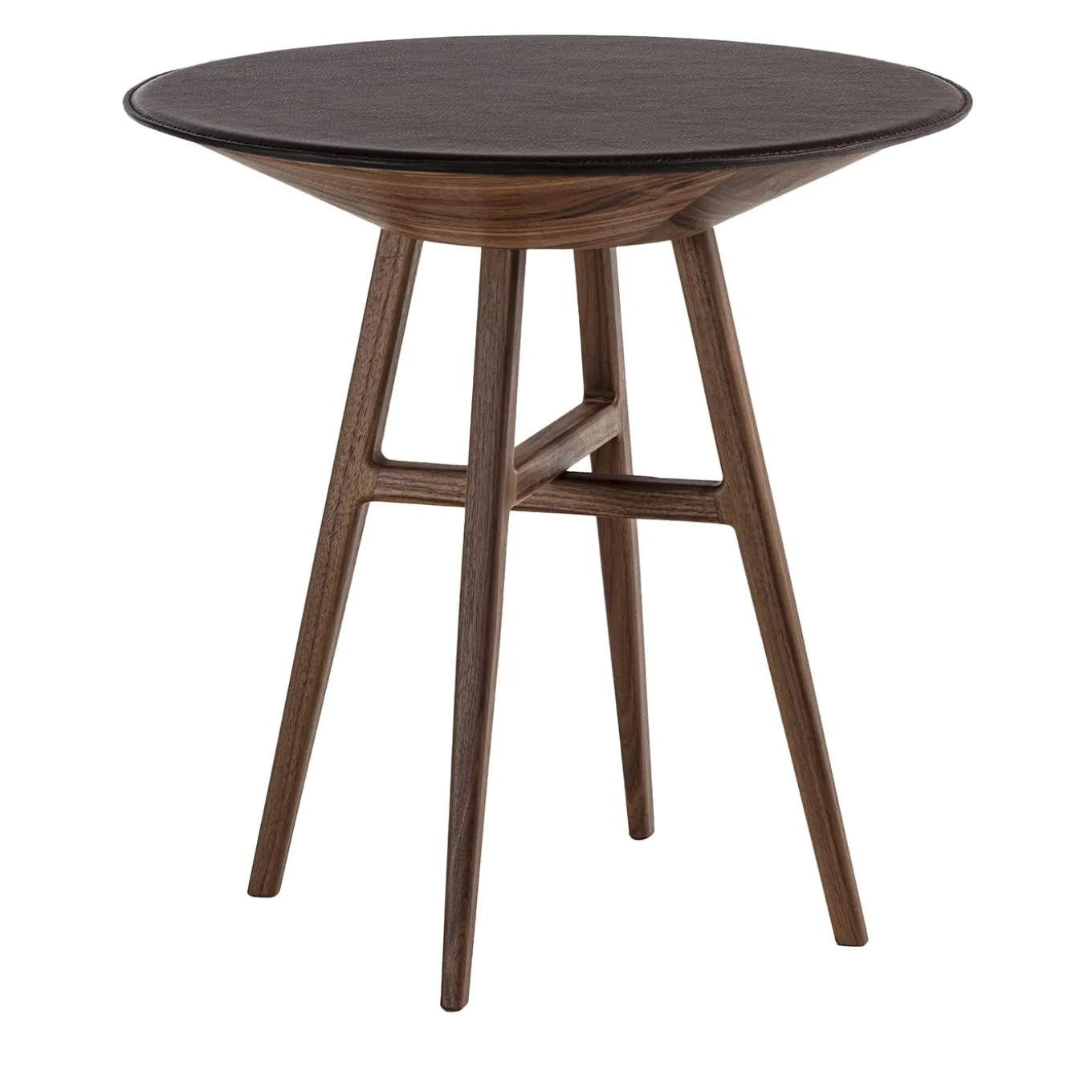 Versatilità e snellezza si incontrano in questo straordinario tavolino d’accento, una soluzione eccellente per arricchire le case moderne caratterizzate da caldi colori neutri. Il piano rotondo rivestito in vera pelle marrone può essere sollevato e staccato per fungere da vassoio indipendente, rivelando un pratico spazio per riporre telecomandi e altri piccoli accessori. Le gambe inclinate aggiungono carattere alla struttura in legno massiccio.