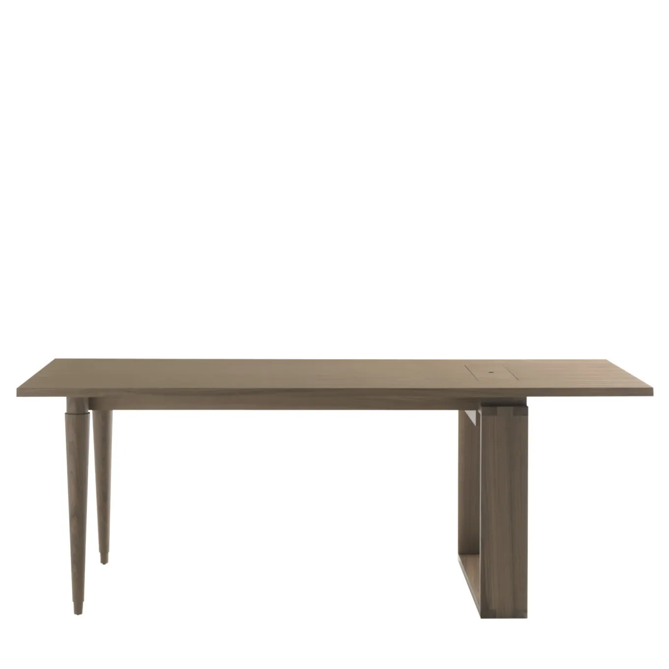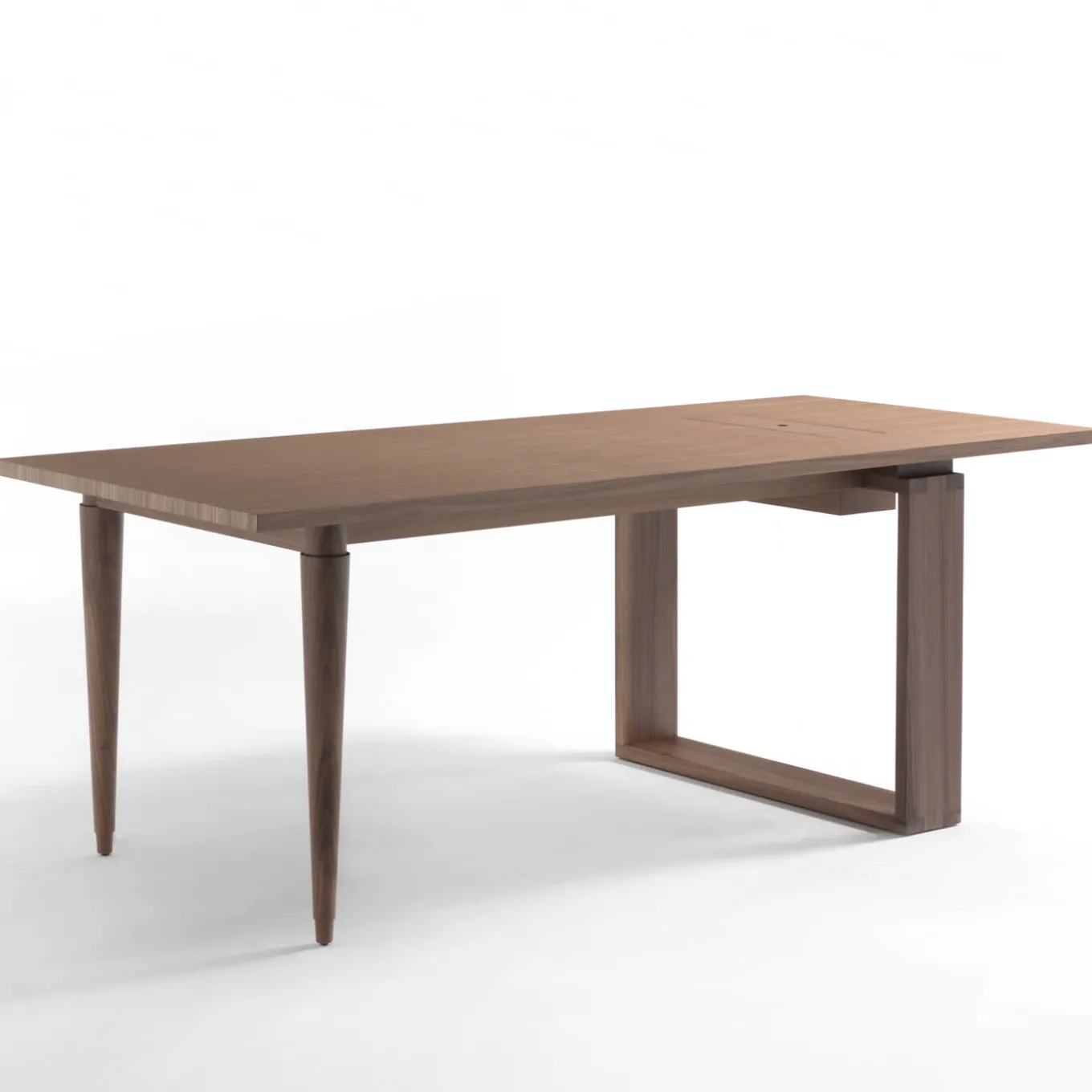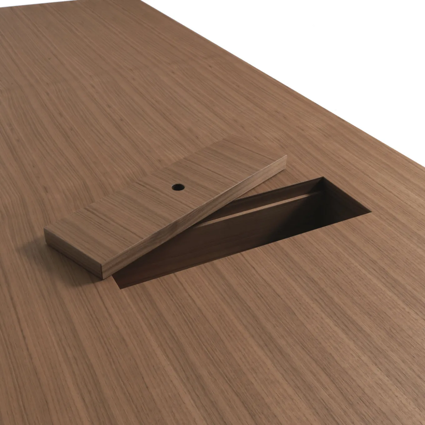 Questo elegante tavolo è interamente realizzato in legno di noce canaletto. La particolarità di questo pezzo è la tasca che può essere utilizzata come ripostiglio e che è accessibile sollevando il suo coperchio tagliato all’interno del piano del tavolo. L’altro materiale disponibile per questo tavolo è il legno di rovere.