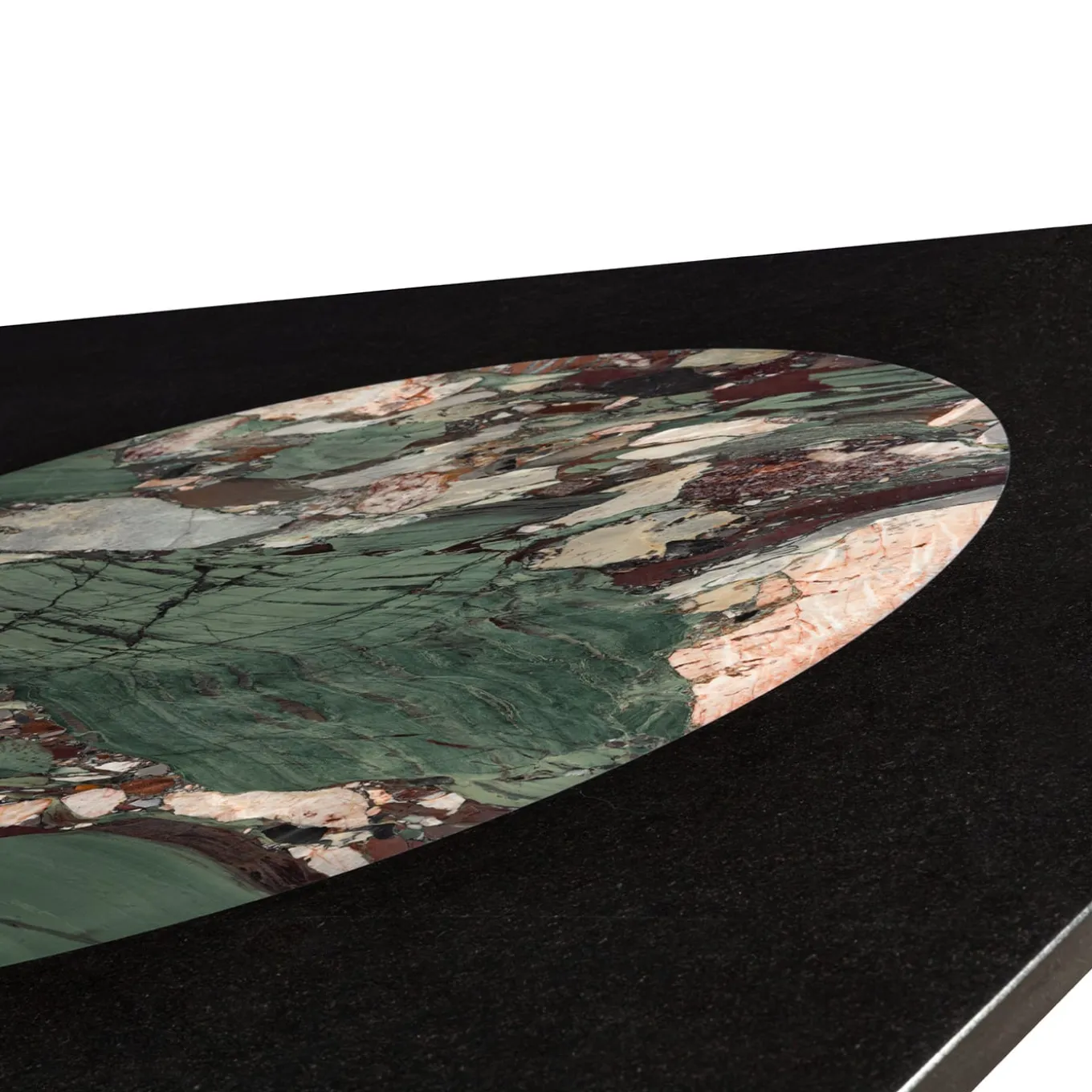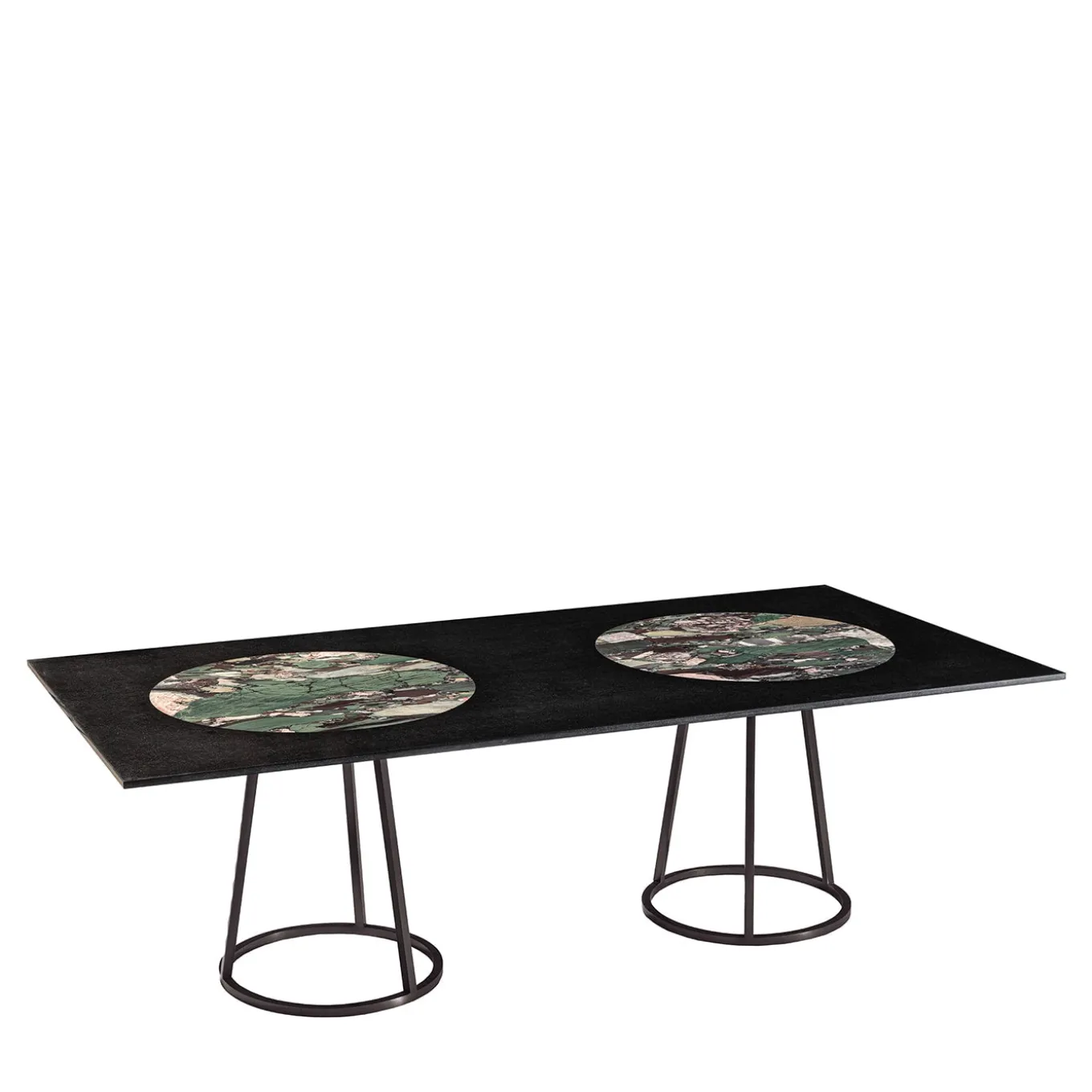 Un design superbo che celebra le forme imprevedibili e sorprendenti che solo la natura può offrire, evocando al contempo la geometria del Pantheon, questo tavolo rettangolare completerà perfettamente gli interni moderni e li accentuerà con un tocco organico. Due ariose ma audaci gambe in metallo rifinite in nero opaco sostengono il piano rettangolare in marmo Nero Belga, in cui sono incastonati due dischi in marmo Opera d’Arte che emergono senza sforzo grazie ai loro intricati tracciati policromi.