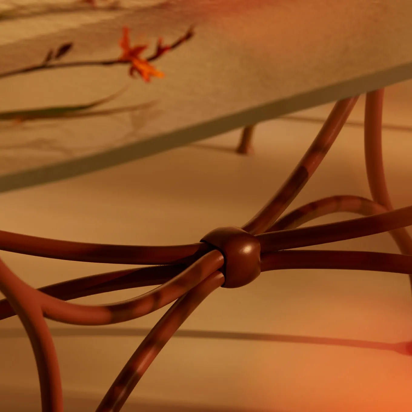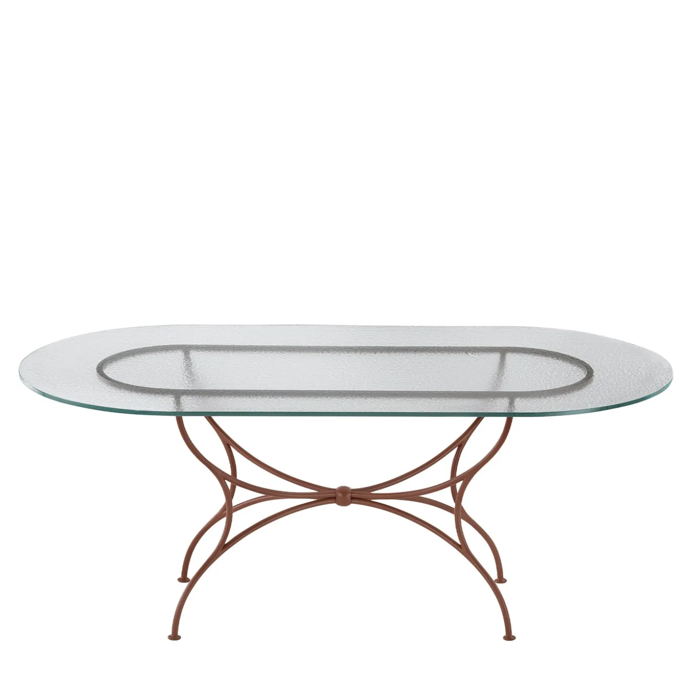Un trionfo di curve sinuose traccia l’intrigante silhouette in ferro zincato che contraddistingue questo superbo tavolo. Verniciata a polvere in una ricca tonalità di marrone, la struttura garantisce un’eccezionale resistenza agli agenti atmosferici e suggerisce una collocazione sicura in terrazze o patii raffinati. La superficie ovale del piano in vetro, che ricorda un lago sottilmente increspato dalla brezza, sottolinea ulteriormente la raffinatezza generale del design. Sono disponibili altre opzioni di colore.