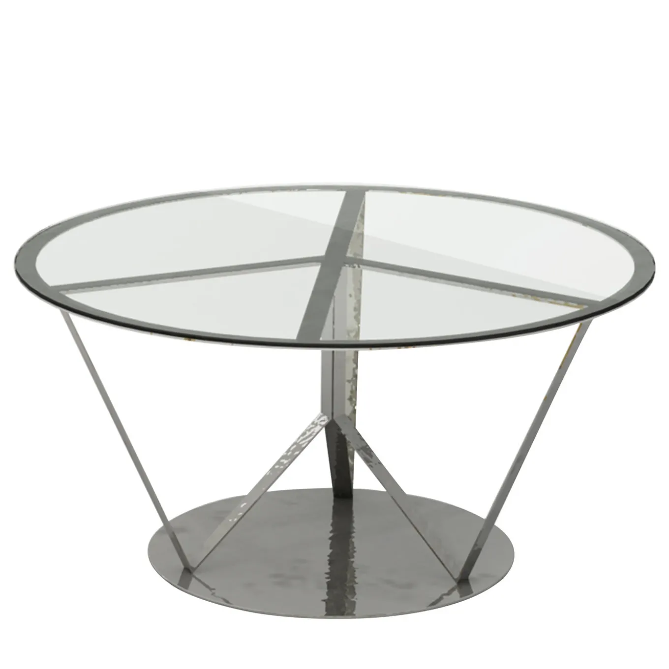 Caratterizzato da una base dal design accattivante, questo tavolo ha una struttura in alluminio con finitura cromata e un piano rotondo in vetro extrachiaro che rivela la sua base scolpita e geometrica. Chiamato Pace per l’iconico segno di pace formato dall’intersezione delle strisce di alluminio sottostanti, questo tavolo innovativo e moderno può essere collocato al centro di una sala da pranzo come punto focale di grande effetto.
