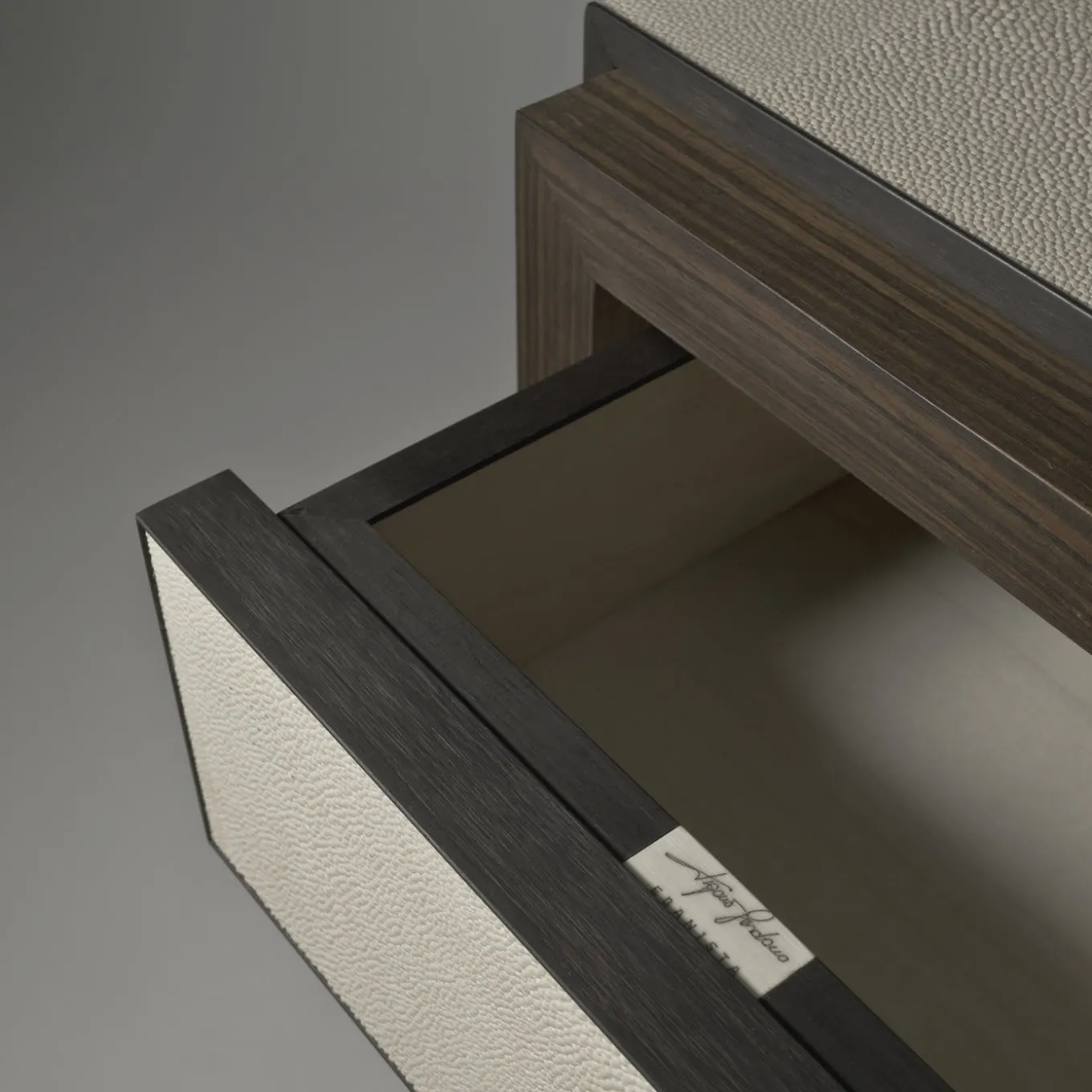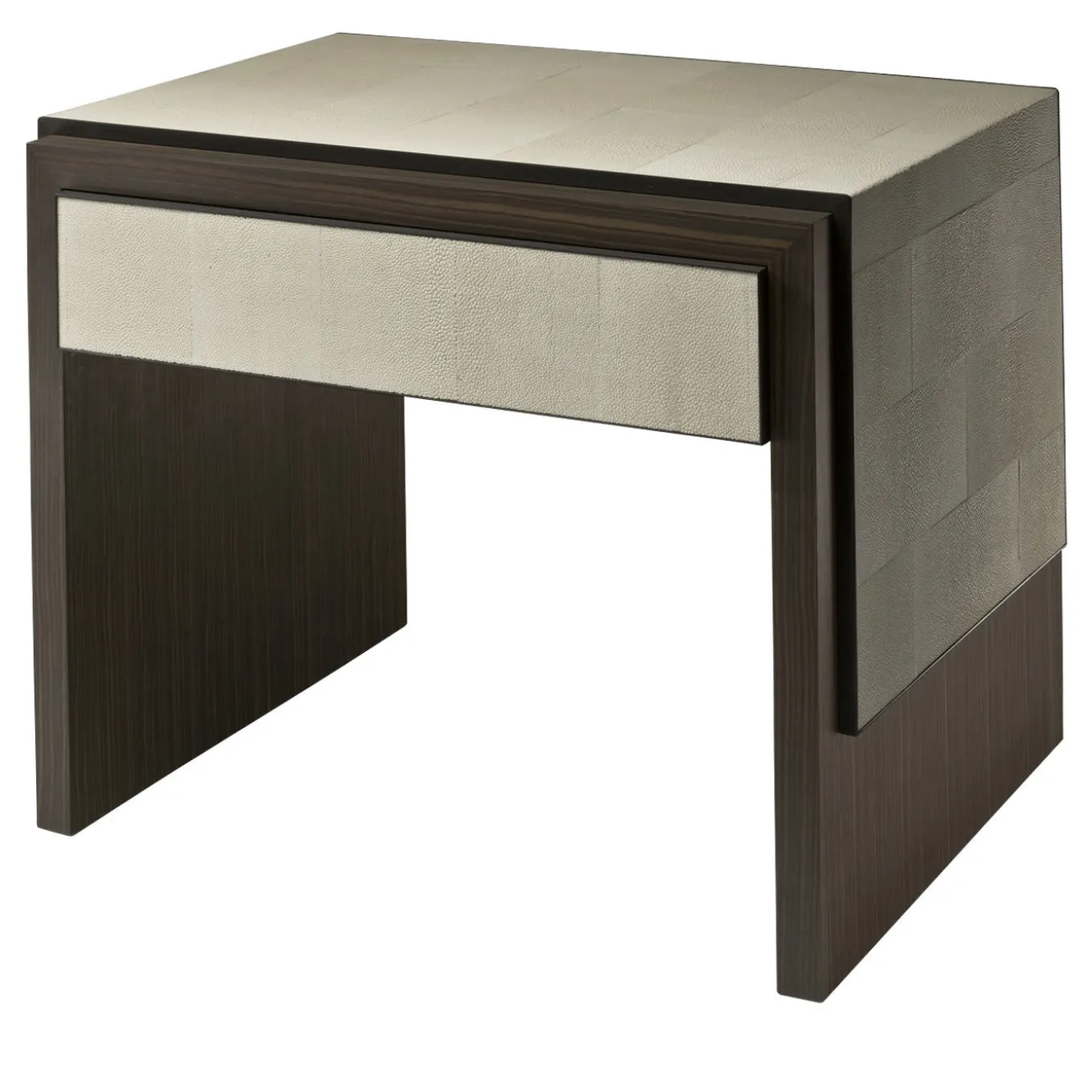 Questo tavolo è in legno di ebano Macassar, con le sue caratteristiche strisce marrone scuro. Presenta accenti in zigrino beige intorno al piano e ai lati e sulla parte anteriore dell’unico cassetto. L’interno del cassetto è in acero.