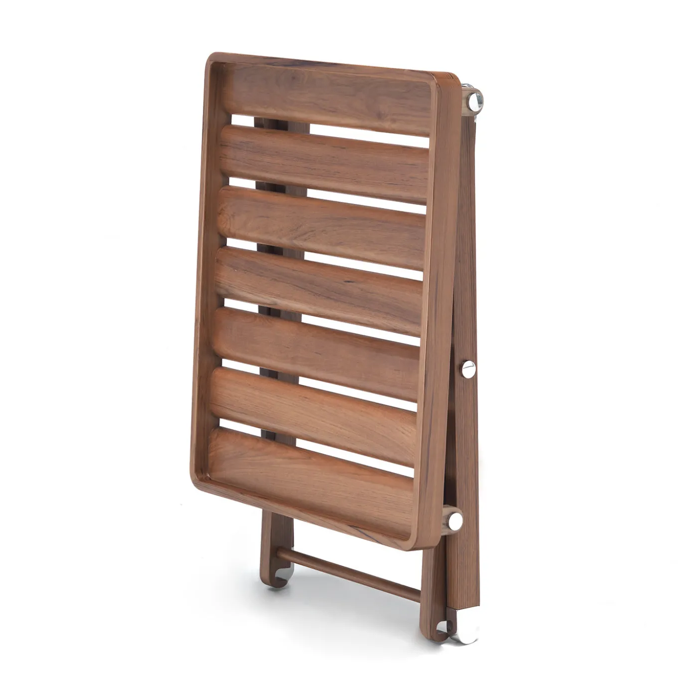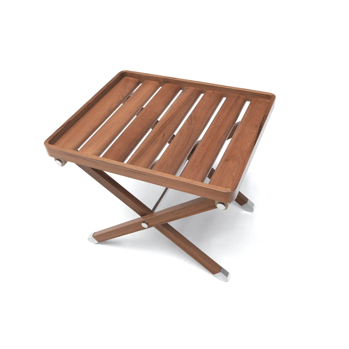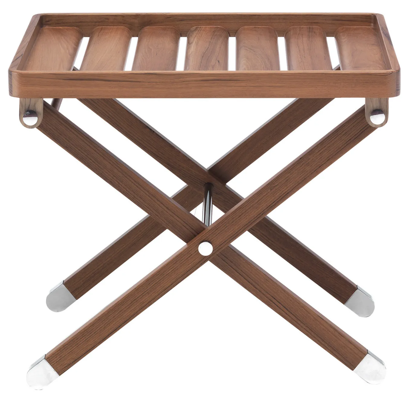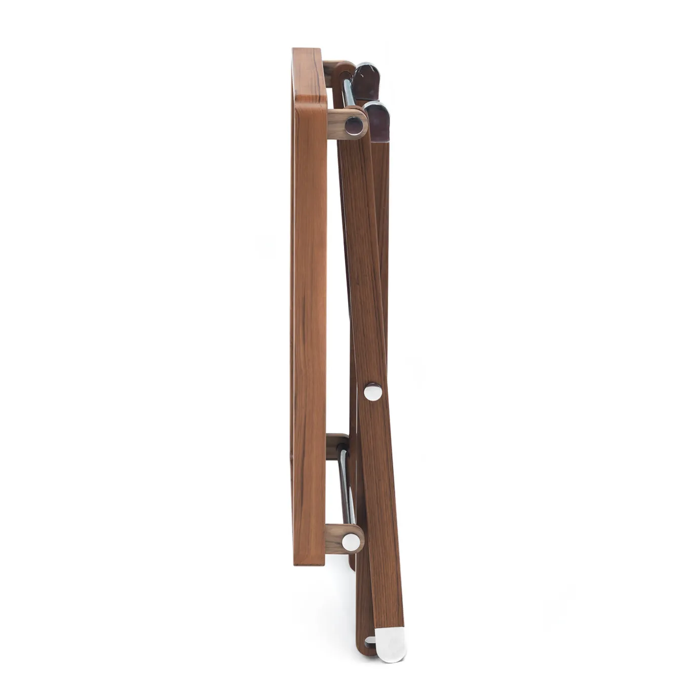 Caratterizzato da una silhouette tanto elegante quanto elementare, questo tavolo pieghevole è il complemento d’arredo ideale per aggiungere una superficie di servizio supplementare dove necessario, senza rinunciare allo stile. La struttura combina legno di iroko e acciaio inossidabile, materiali rinomati per la loro durata e resistenza.