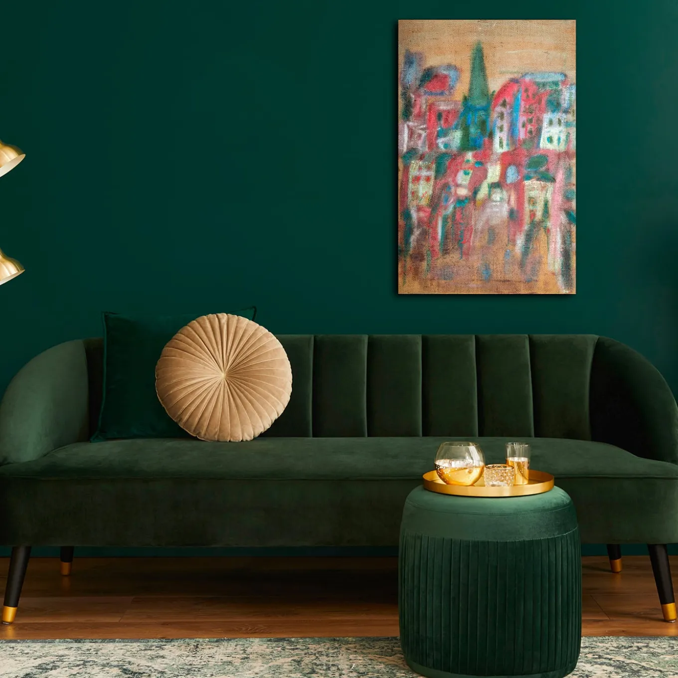 In quest’opera d’arte passato e presente si intrecciano in una suggestiva armonia. Il bianco e il rosso, colori di una città antica e magica, si fondono in un’unica visione. Il campanile, faro luminoso, guida lo sguardo attraverso un labirinto di case, creando un’atmosfera intima e piena di calore umano. La tecnica utilizzata dall’artista crea un’illusione di profondità e movimento, invitando lo spettatore a esplorare ogni angolo di questa città immaginaria.