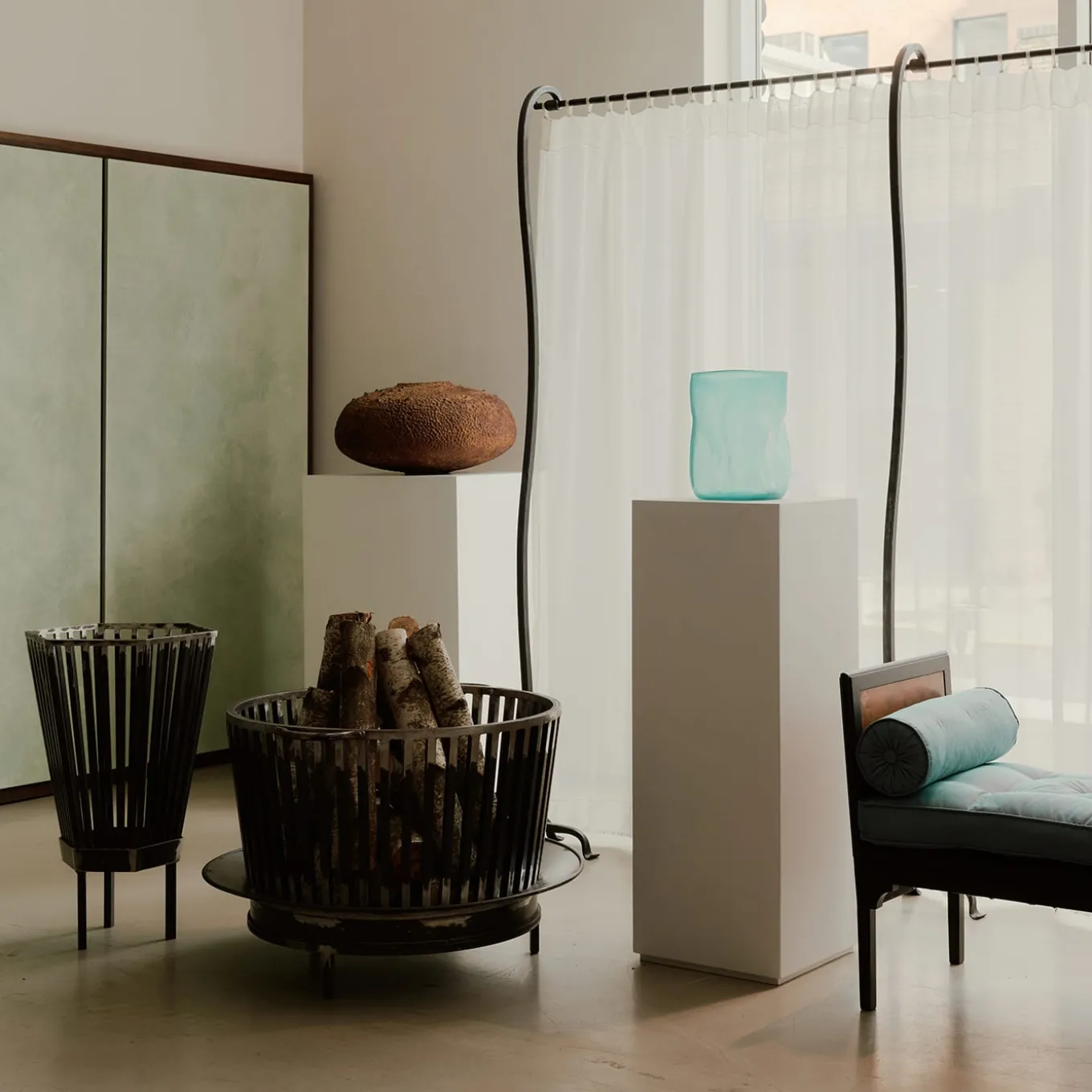 Questa griglia rotonda è stata progettata pensando alle notti fredde e stellate trascorse con gli amici riuniti intorno al camino. Da collocare al centro di una terrazza o di un patio per fornire calore e illuminazione, presenta una base con piedi e un cesto con maniglie, tutti realizzati in acciaio per garantire prestazioni impeccabili di durata e resistenza. Questo pezzo è attualmente in mostra e immediatamente disponibile presso la Galleria Artemest di New York.