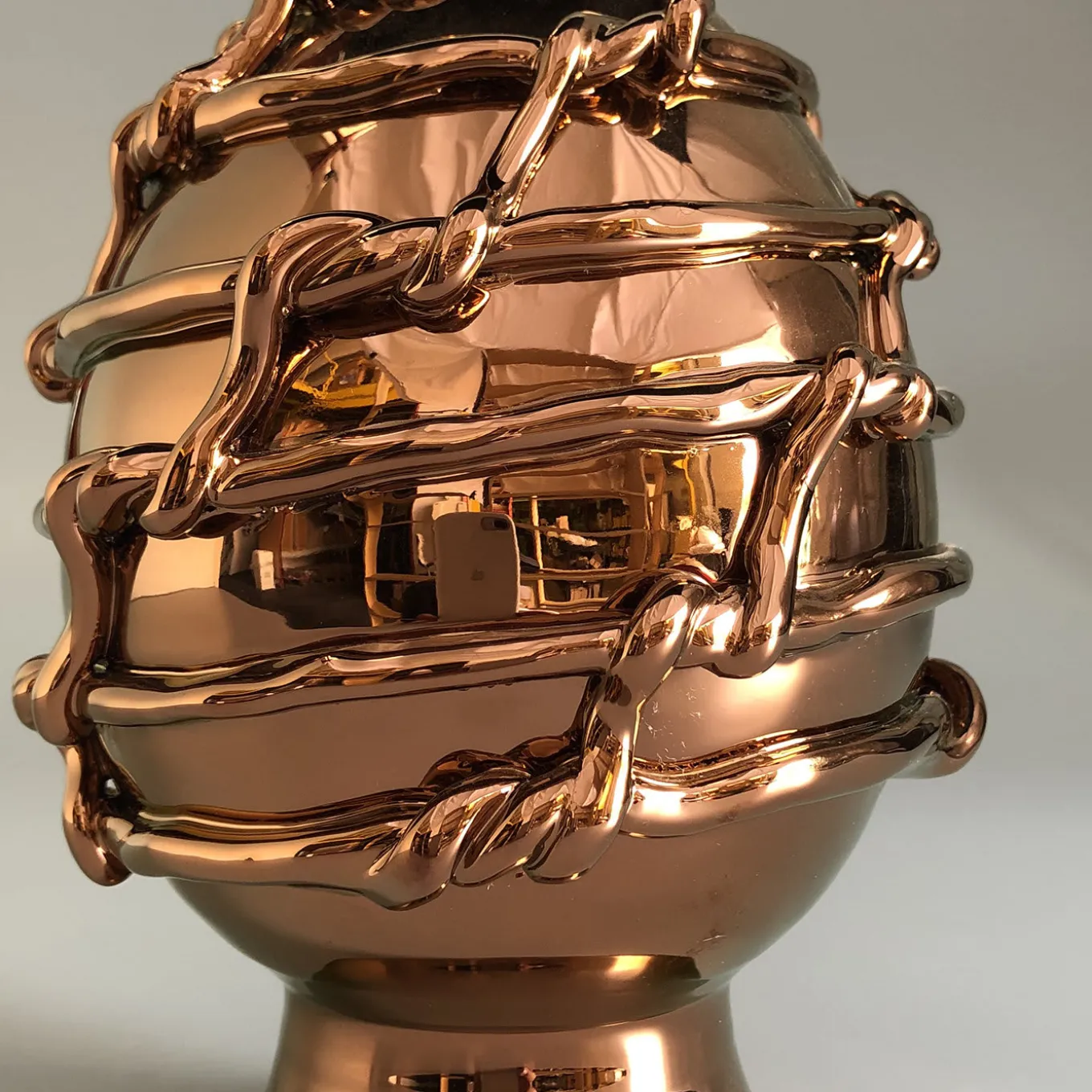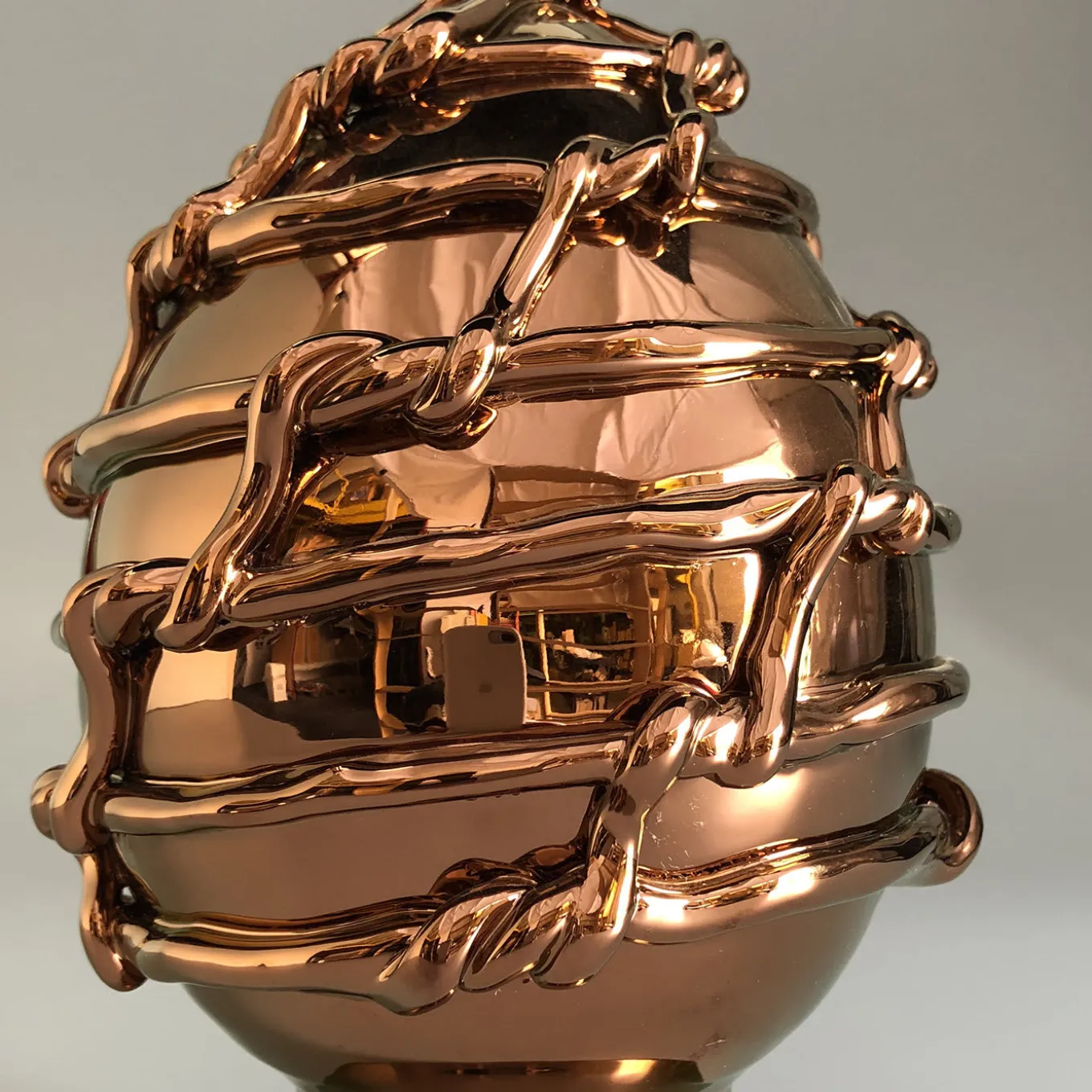 Un portafortuna siciliano che simboleggia il benessere, ispirato agli iconici pini dell’isola. Filata a mano e avvolta in corde intrecciate, la pigna viene poi rivestita di smalto bianco per una finitura liscia. Prima di entrare in forno una terza e ultima volta, la pigna viene dipinta di bronzo con un pennello a setole morbide.