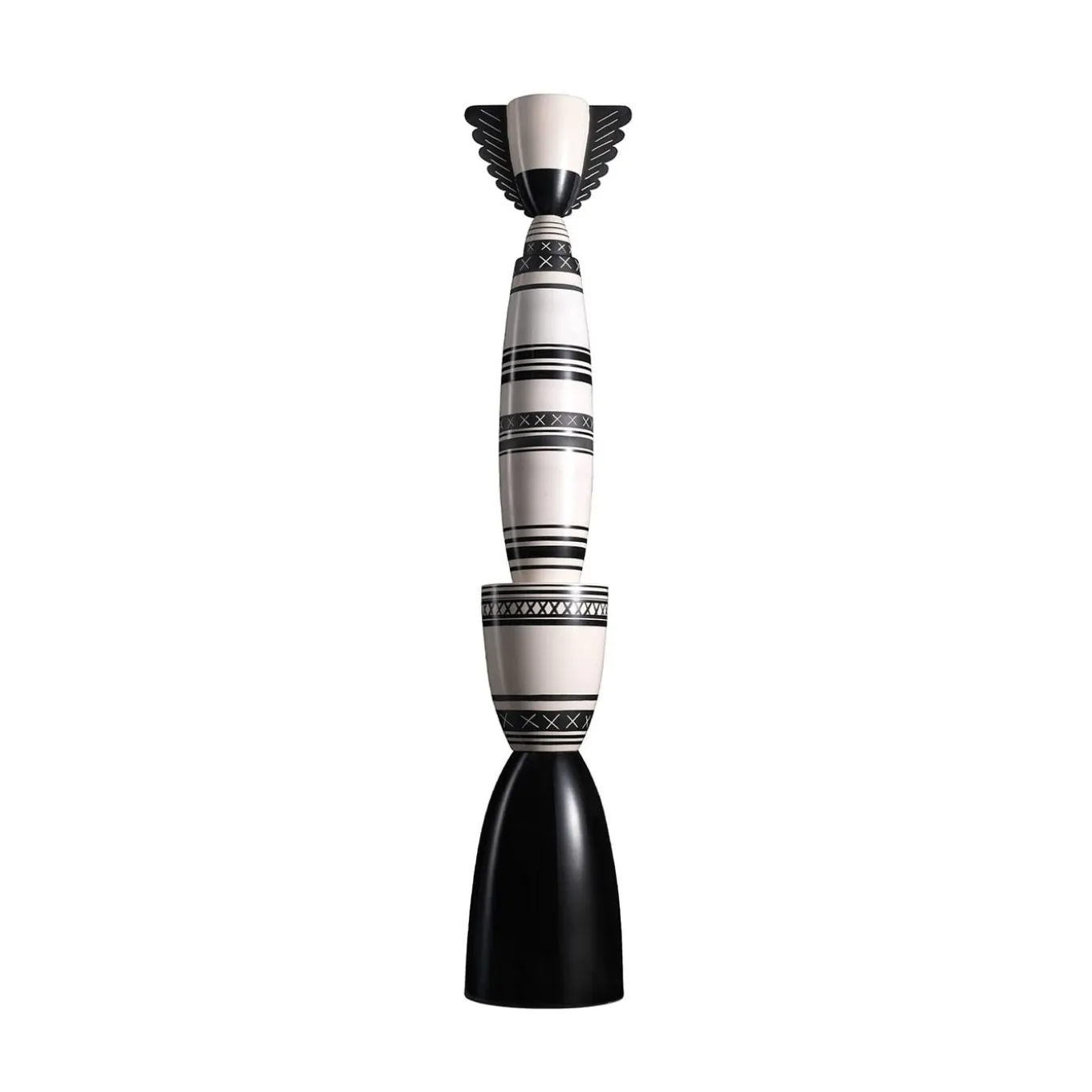 Velocità in bianco e nero. Un ritmo tribale si dispiega, guidato da geometrie e architetture magiche in cui convergono energie e anime. Vasi conici e sferici si intrecciano con linee e croci in un suggestivo rituale in bianco e nero. Questo totem, composto da quattro pezzi di argilla fatti a mano, presenta uno smalto nero opaco, una barbottina bianca dipinta con accenti neri e una finitura cristallina trasparente. Edizione limitata di 9 pezzi, disegnata da Ugo La Pietra.
