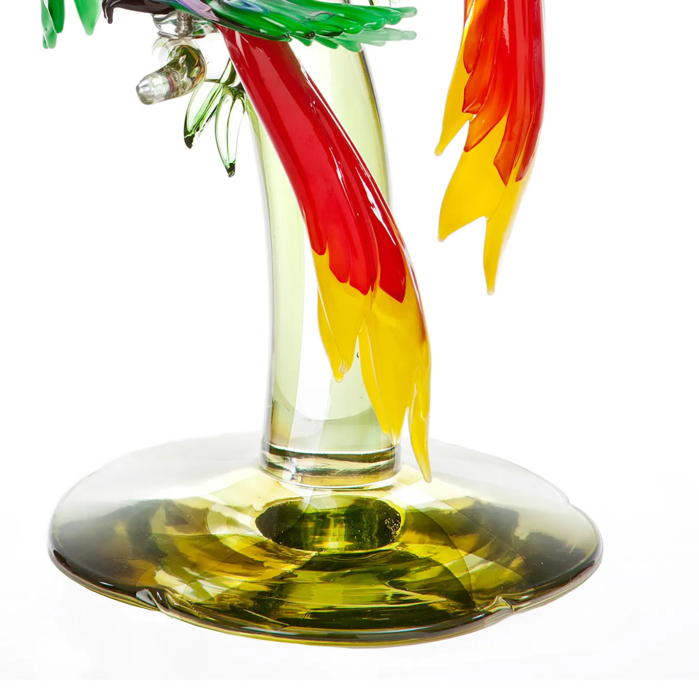 Questi tre eccezionali pappagalli Macaw sono stati realizzati dal maestro soffiatore Zanetti sull’isola di Murano a Venezia. Notevolmente animati e colorati, questi uccelli sono realizzati in vetro massiccio e si appollaiano su un piedistallo di rami in vetro trasparente con dettagli verdi nelle foglie. Gli uccelli sono dotati di piccole aste incorporate che si appoggiano facilmente in una sede metallica sul piedistallo per un facile montaggio.