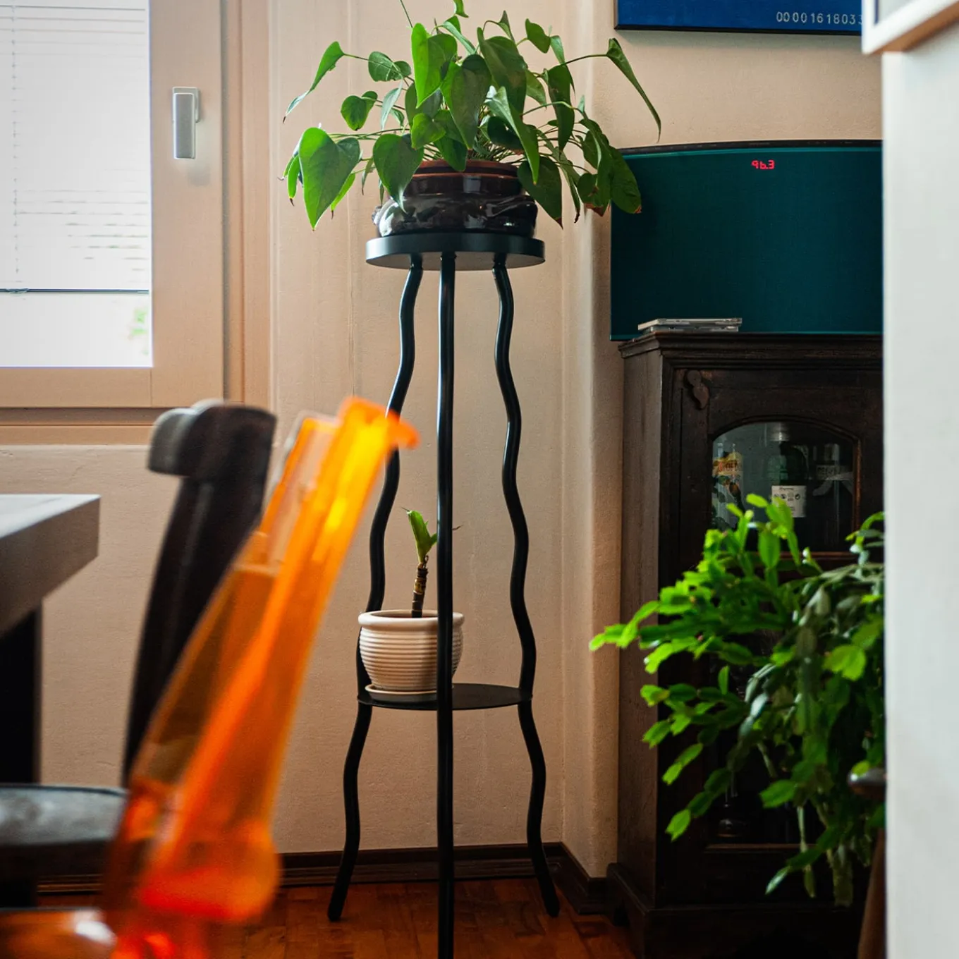 Elegante ed eccentrico nella sua silhouette di ispirazione fitomorfa, questo esile portavaso a treppiede è un pezzo artigianale interamente realizzato a mano e infine verniciato a polvere in nero. Le tre gambe sono abilmente piegate a mano, mentre il ripiano centrale e il vassoio superiore fungono da base per l’esposizione di rigogliosi vasi di fiori o piante rampicanti.