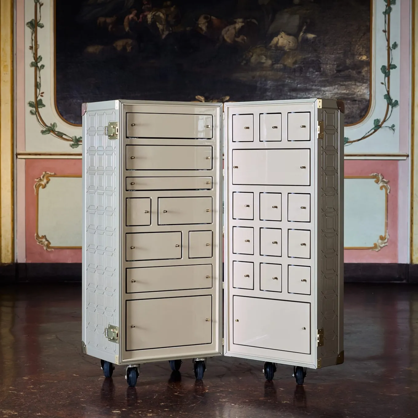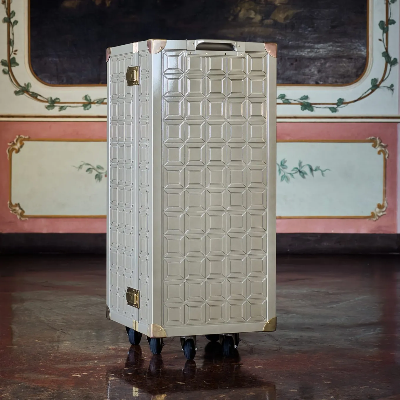 Doha è un trunk di lusso creato per organizzare e mostrare gioielli e orologi, grazie a couvettes dedicate al suo interno. L’esterno presenta una laccatura bronzata lucida con un decoro a motivo 3D, serrature in ottone opaco, protezioni per i bordi e bordature e maniglie laccate tono su tono. L’interno offre una finitura laccata lucida con manopole in ottone e couvettes rivestite in Alcantara, adatte per l’uso in un contesto di boutique di gioielli di lusso. Il trunk è dotato di ruote per una facile mobilità.