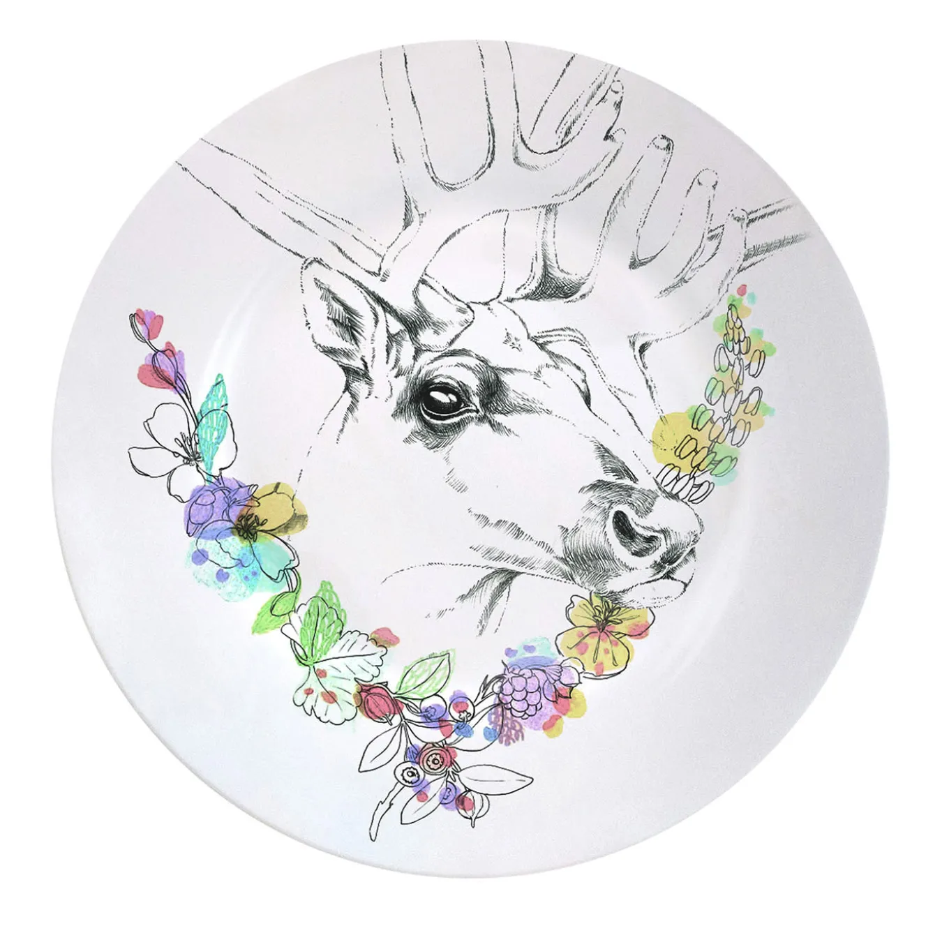 Questo splendido piatto della collezione An Ode To The Woods è ricco di suggestioni, con le sue ghirlande policrome di fogliame e fiori selvatici che circondano il profilo aggraziato di un caribù disegnato a matita. Realizzato in porcellana fine e dipinto a mano, è un design adatto al forno e alla lavastoviglie, disponibile anche con altre specie animali del bosco per composizioni tanto vivaci quanto eleganti.