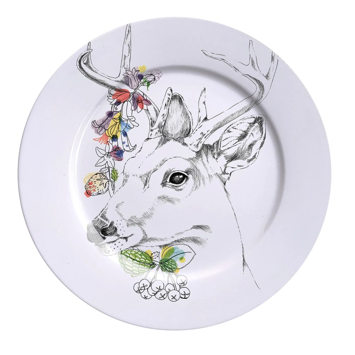 Una vetrina di arte decorativa ispirata alla flora e alla fauna dei boschi, questo piatto in porcellana fa parte della collezione An Ode To The Woods, dal nome eloquente, che comprende anche altri tipi di animali. Una ghirlanda di fiori di campo e foglie dipinta a mano con vibranti macchie di colore si intreccia con il ritratto di un cervo dalla coda bianca, ottenuto con pennellate minuziosamente sottili che ricordano un vero e proprio disegno a matita. Lavabile in forno e in lavastoviglie, è un pezzo unico artigianale.