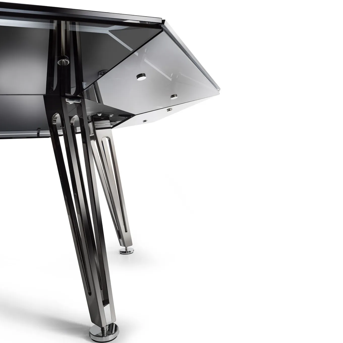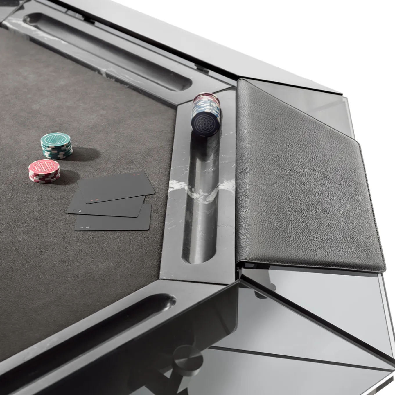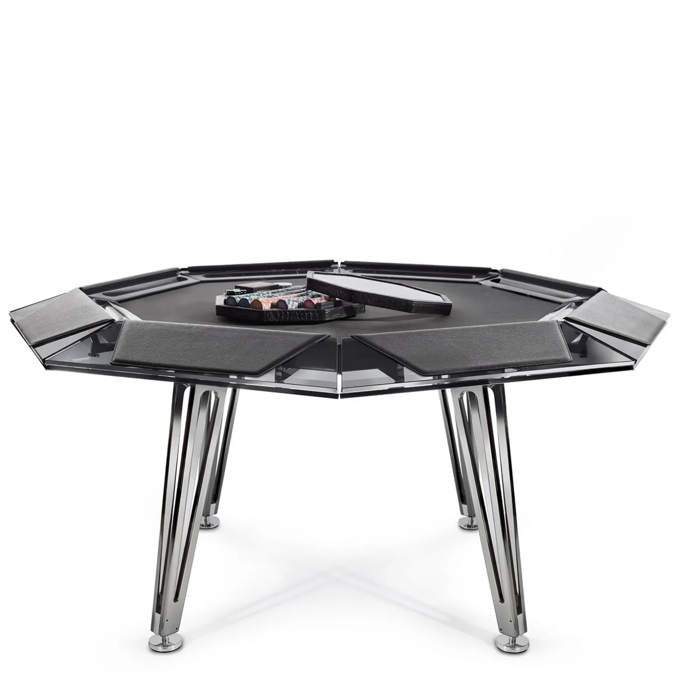 Vero e proprio gioiello per le sale da gioco di casa, questo tavolo da poker ottagonale per otto giocatori vanta un design accattivante e decisamente contemporaneo, ricco di materiali pregiati e angoli vivi. Quattro gambe strombate in metallo arricchite da una finitura cromata nera sostengono la struttura in vetro, ispirata all’aspetto e al taglio classico dei diamanti. Una cornice audace abbraccia il tappeto da gioco nero in Alcantara®. I braccioli in pelle sono disponibili a un prezzo aggiuntivo, mentre un sontuoso set da gioco è incluso nell’acquisto.