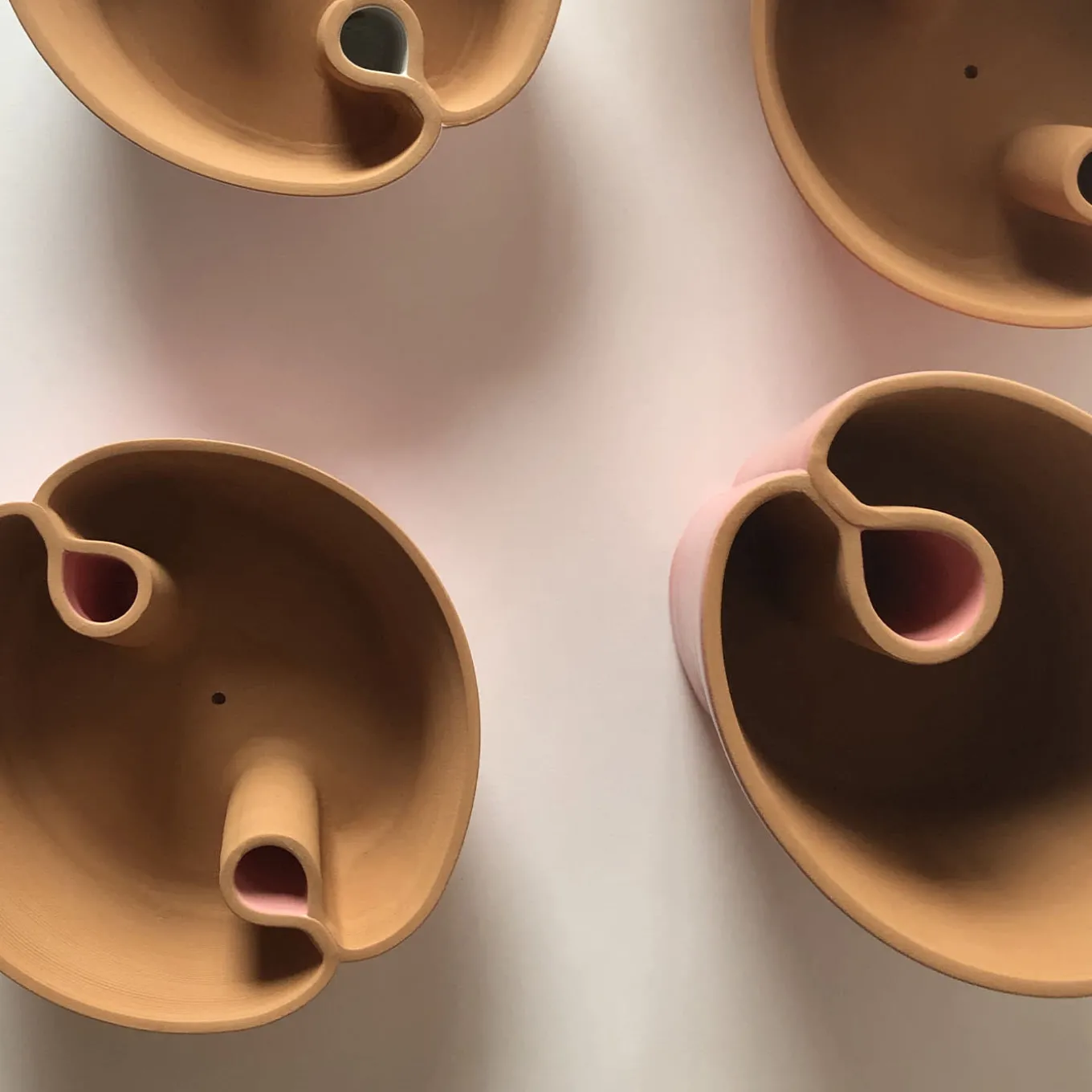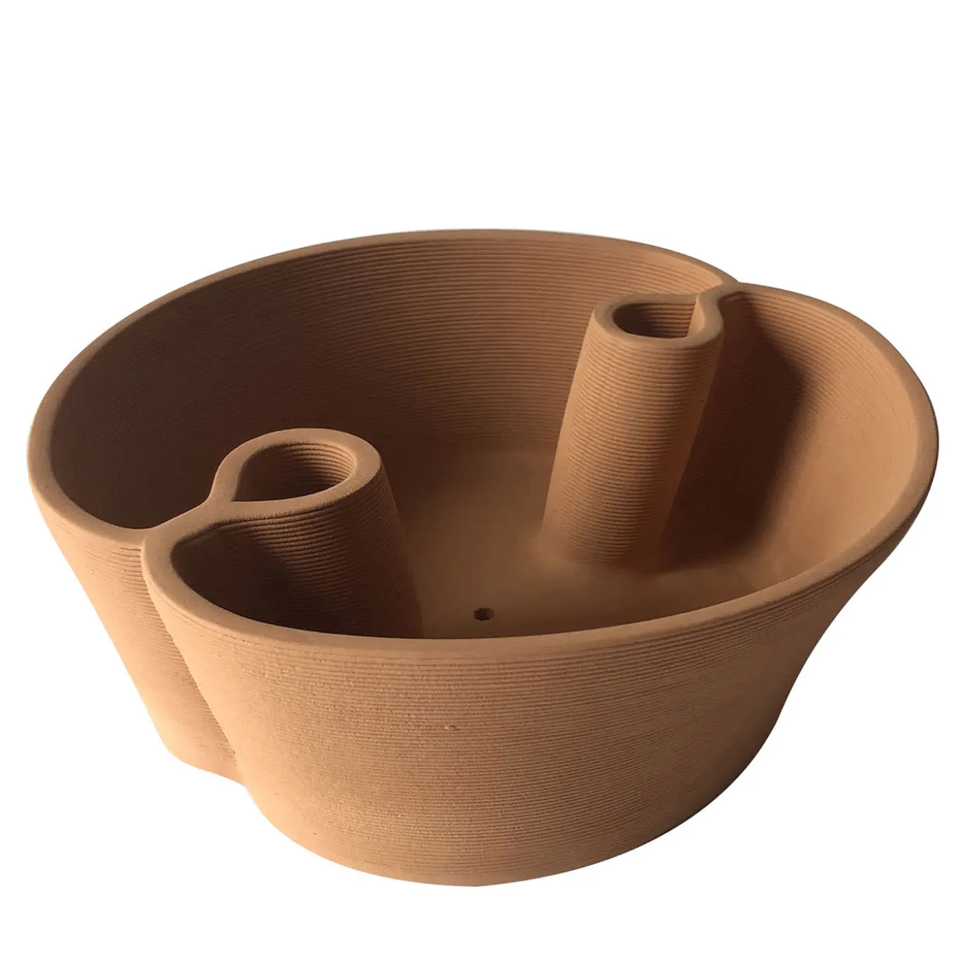 Vaso per piante in argilla rossa, stampato con tecnologia 3D. Le linee descrivono una silhouette con pareti svasate e due elementi tubolari a goccia per la raccolta dell’acqua, attivati dalla porosità dell’argilla.