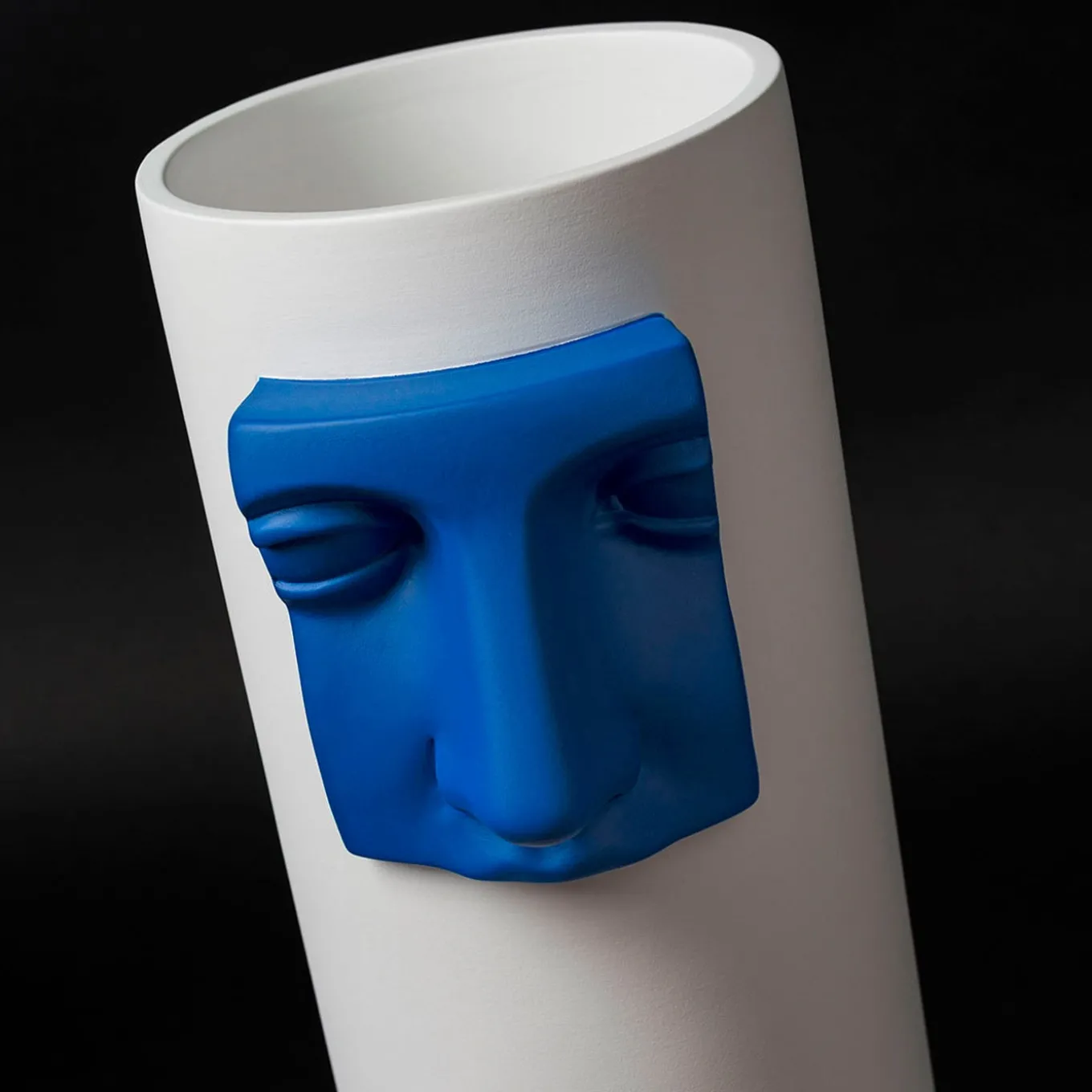 L’arte classica italiana e il design moderno si fondono in questo pezzo sofisticato: un vaso cilindrico e pulito in ceramica bianca, decorato con un inserto blu vivo che ricrea il naso di Giunone, rappresentazione inconfondibile e senza tempo, raffigurata nella scultura classica e neoclassica. Questo pezzo suggestivo infonderà senza sforzo un tocco di raffinatezza in interni moderni e minimalisti.