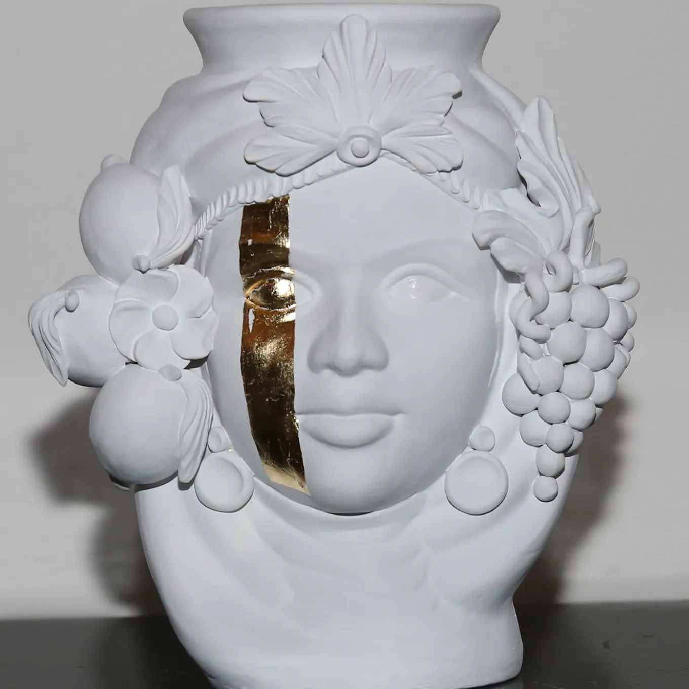 Un’ode poetica alla tradizione artigianale e alla sensibilità moderna, questo vaso antropomorfo di una donna siciliana evoca la grandezza della conquista moresca in Sicilia. Interamente realizzato a mano dalla maestra ceramista Stefania Boemi, questo vaso vanta un volto espressivo caratterizzato da un copricapo ornato, orecchini pendenti, labbra carnose e lussureggianti ciocche di capelli intrecciate con frutti siciliani. L’occhio destro è caratterizzato da una fascia in lamina d’oro che corre verticalmente lungo il viso, un dettaglio accattivante che sottolinea la bellezza dello sguardo della donna. Il vaso non può essere riempito d’acqua.