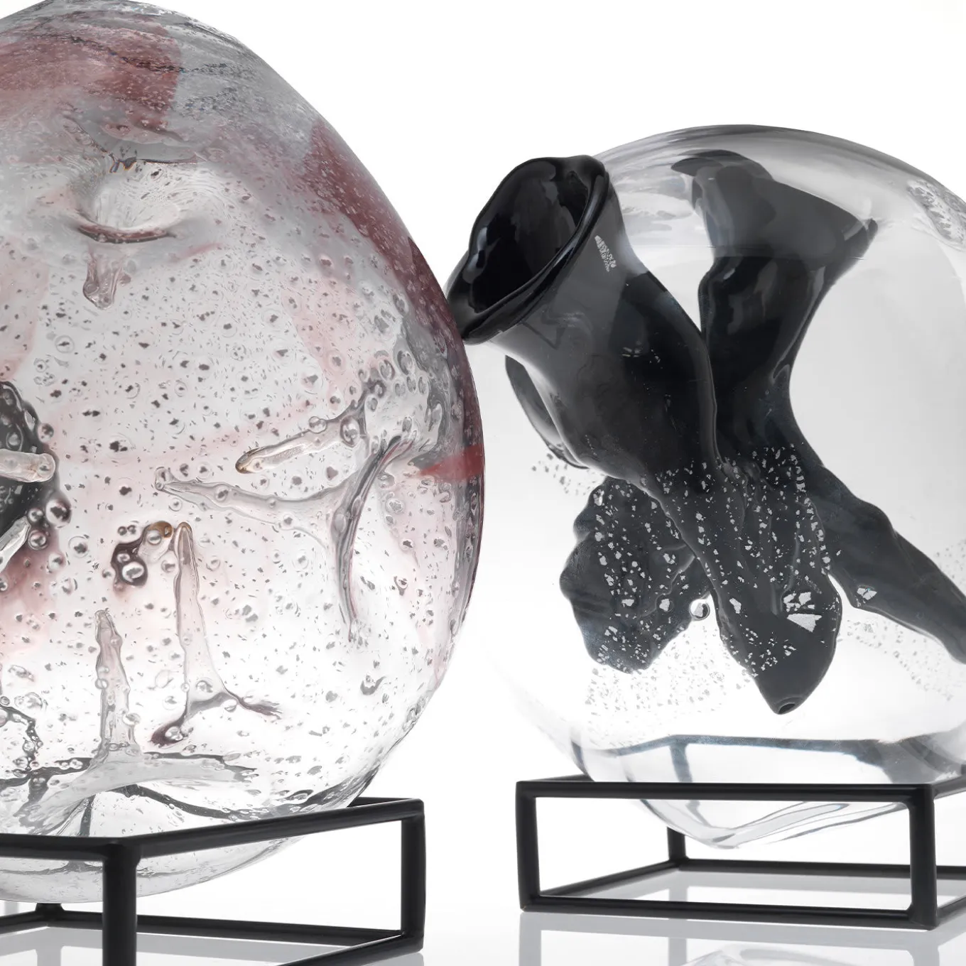 “Soffiato a bocca nell’isola di Murano, questo pezzo unico in vetro è sospeso in una semplice base metallica che completa l’oggetto in un equilibrio di forme elementari e luce. Glome X allude ai primissimi istanti della creazione, la cosiddetta inflazione cosmica, una teoria che descrive come, nei suoi primi istanti, l’Universo si sia espanso più velocemente della luce”. Vaso in vetro di Murano soffiato a bocca, con colorazione rosa a colata e frammenti d’argento. Base in metallo con finitura nera lucida. Non sono disponibili varianti.