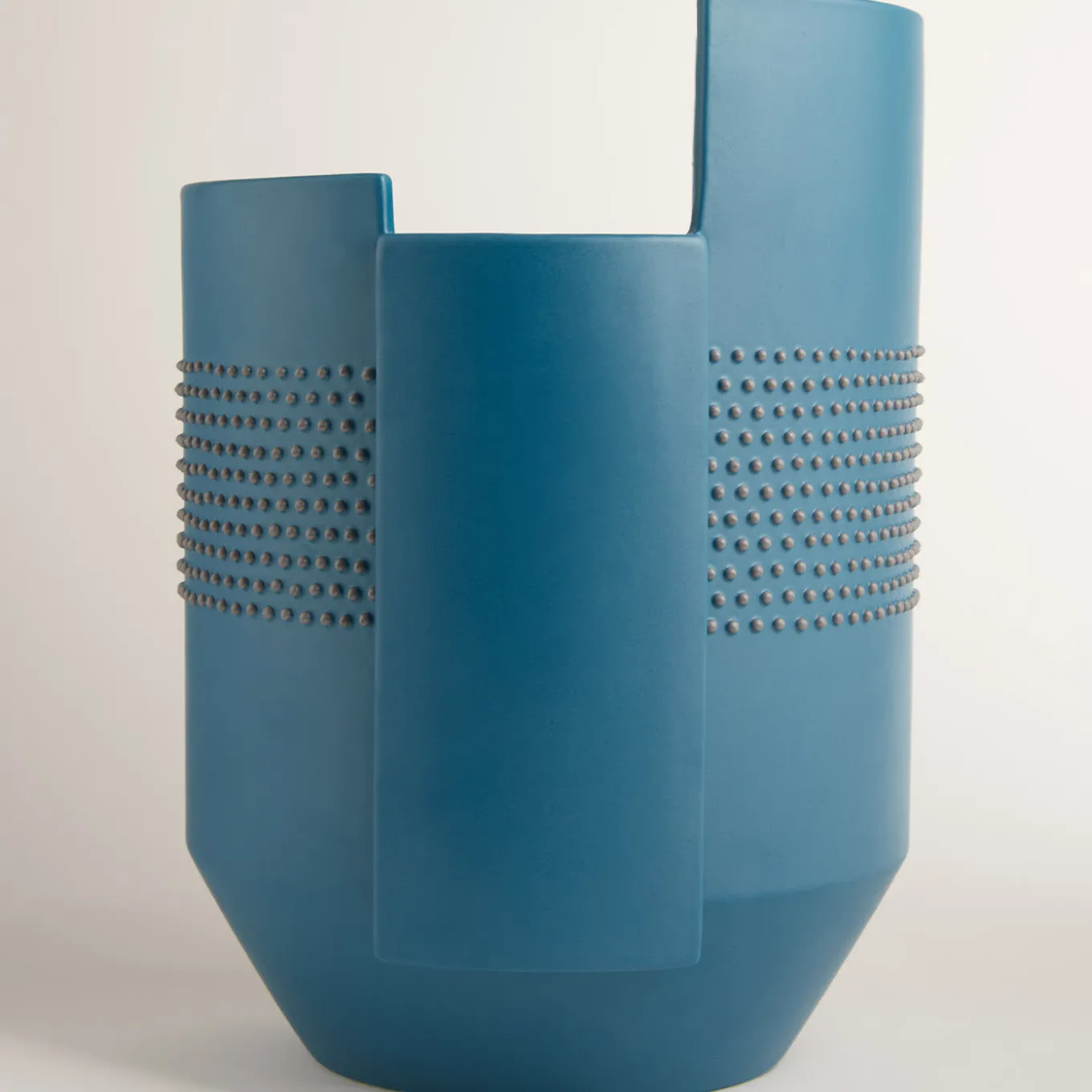 A prima vista, il vaso Hugo appare semplice e lineare e assume un carattere deciso e incisivo grazie alla particolarità decorativa del Riccio. Il nome Hugo ben interpreta la sua estetica. Il decoro Riccio è uno standard, un classico nella storia della ceramica Bagni/Nuoveforme fin dai primi anni Settanta, quando fu ideato da Alvino Bagni che, dopo averlo messo a punto, progettò e realizzò anche attrezzature speciali per eseguire al meglio questo decoro.