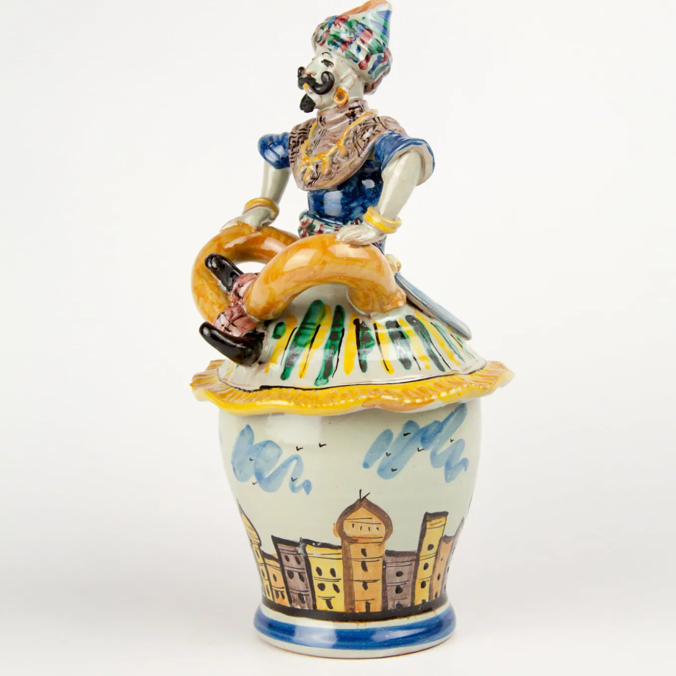 Questo bellissimo vaso fischiante è stato realizzato utilizzando una combinazione di tornio e modellazione a mano dei dettagli. Il vaso raffigura un uomo su un tappeto volante che sorvola una città. Il dispositivo per il fischio si trova sul retro della figura.