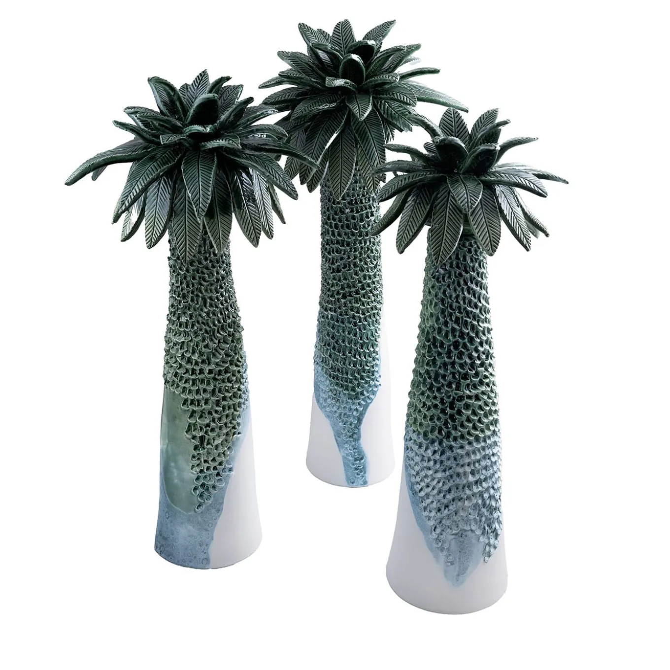 Il grande vaso Palma è composto da due splendidi pezzi. La parte inferiore presenta un vaso intricato e inciso con colori cristallini vivaci e una finitura a smalto bianco opaco. La parte superiore è modellata ad arte come foglie di palma, aggiungendo un tocco di naturalezza ed eleganza. Un mix perfetto di texture, colore e design per valorizzare qualsiasi interno.