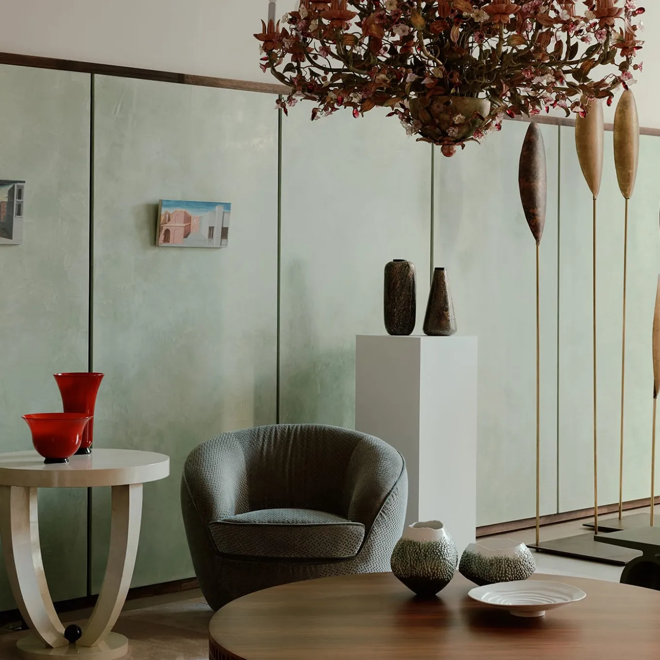 Creata con una miscela di colori in polvere, tra cui la famosa avventurina, su una base di vetro avorio con applicata, a caldo, una foglia d’argento che si ossida a contatto, la massa vitrea viene sapientemente lavorata dal maestro Matteo Tagliapietra creando sulla superficie dei veri e propri disegni e volute da cui deriva il nome della collezione. Oggetti unici ed esclusivi frutto di anni di sperimentazione che innovano la grande tradizione del vetro di Murano.