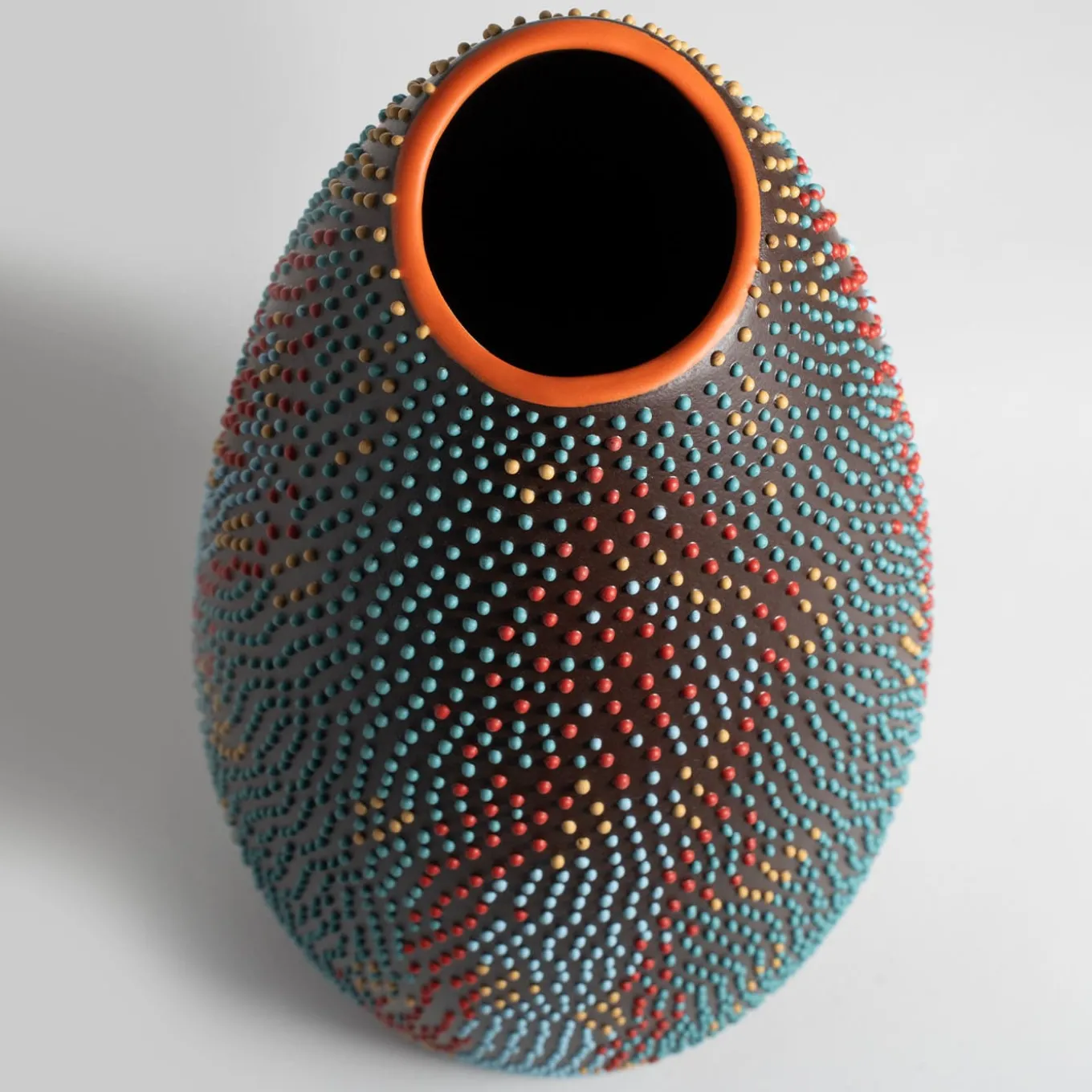 Caratterizzato da una silhouette rigonfia che si assottiglia fino a una bocca stretta accentuata da un vibrante colore arancione, questo vaso in ceramica è un trionfo di colori e dettagli ipnotizzanti. La silhouette di un camaleonte emerge dalla sapiente distribuzione dei punti di colore diverso di cui è ampiamente costellato l’esterno. Dipinto minuziosamente a mano, ogni vaso è un’opera d’arte unica e imprevedibile.