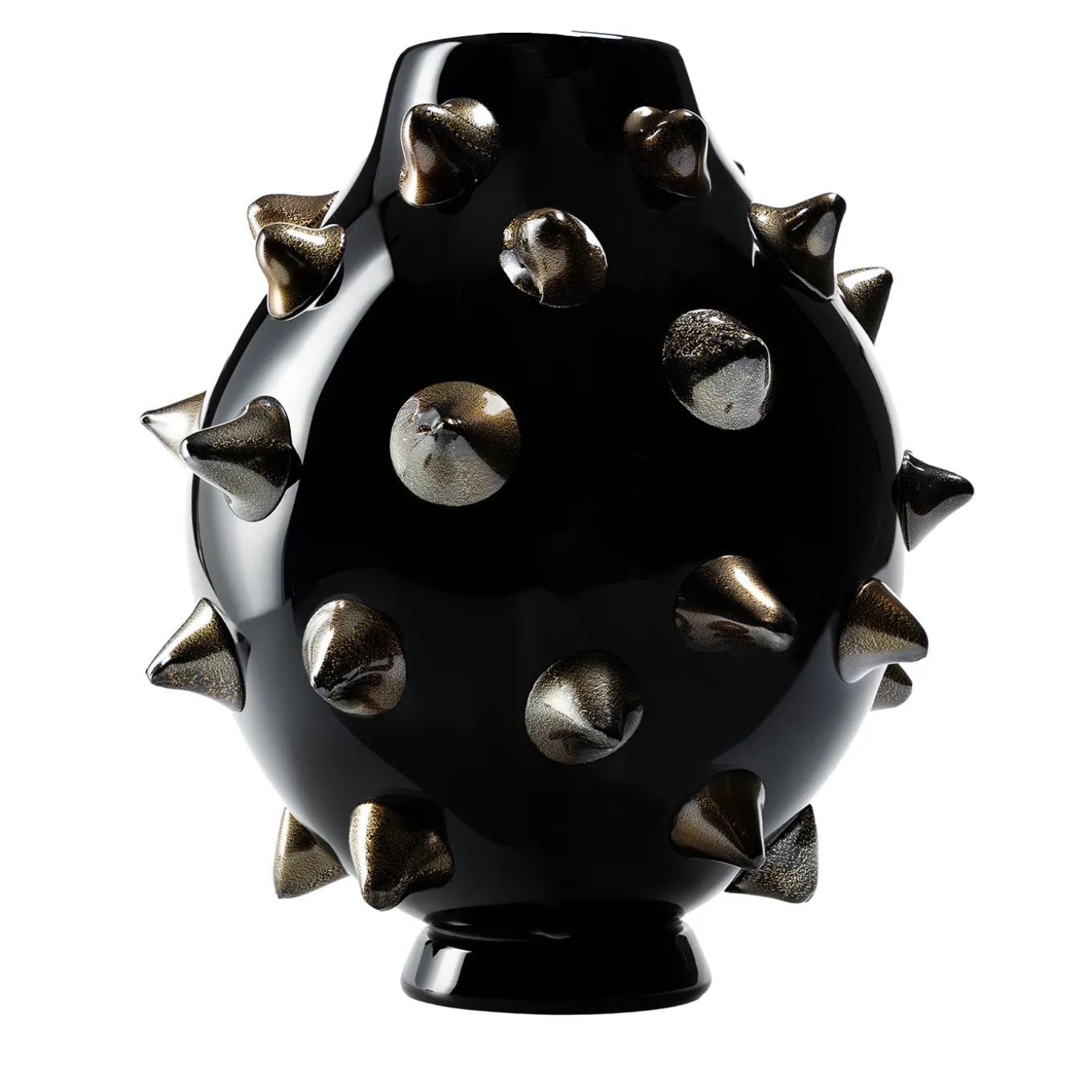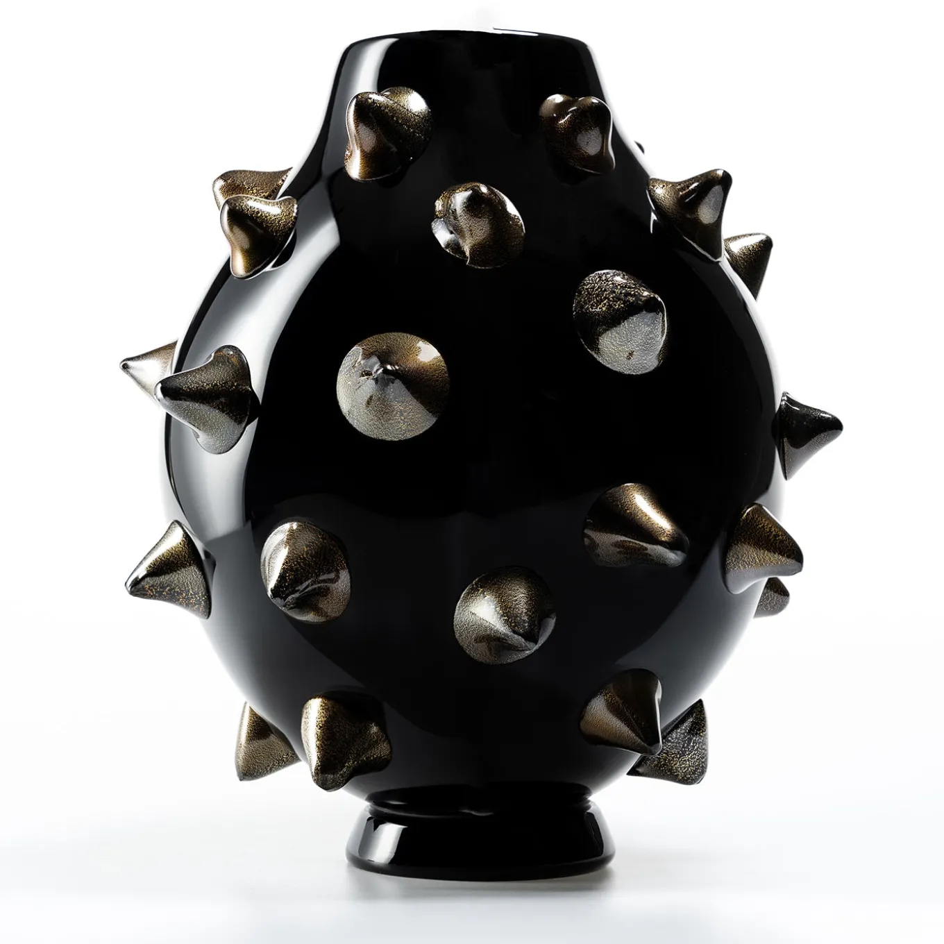 Murano Black è un pezzo d’arte unico e sorprendente. Il suo design artigianale lo rende unico nel suo genere, mentre il colore nero profondo aggiunge un’aura di mistero e fascino. Le borchie in vetro soffiato e la foglia d’oro 24k, applicata una ad una con la tecnica dell’incalmo, conferiscono un tocco di lusso, contrastando splendidamente con la superficie del vetro. Questo vaso irradia un’intensa energia e forza espressiva, fondendo tradizione e innovazione. Un’opera d’arte davvero accattivante, perfetta per dare carattere a qualsiasi spazio.