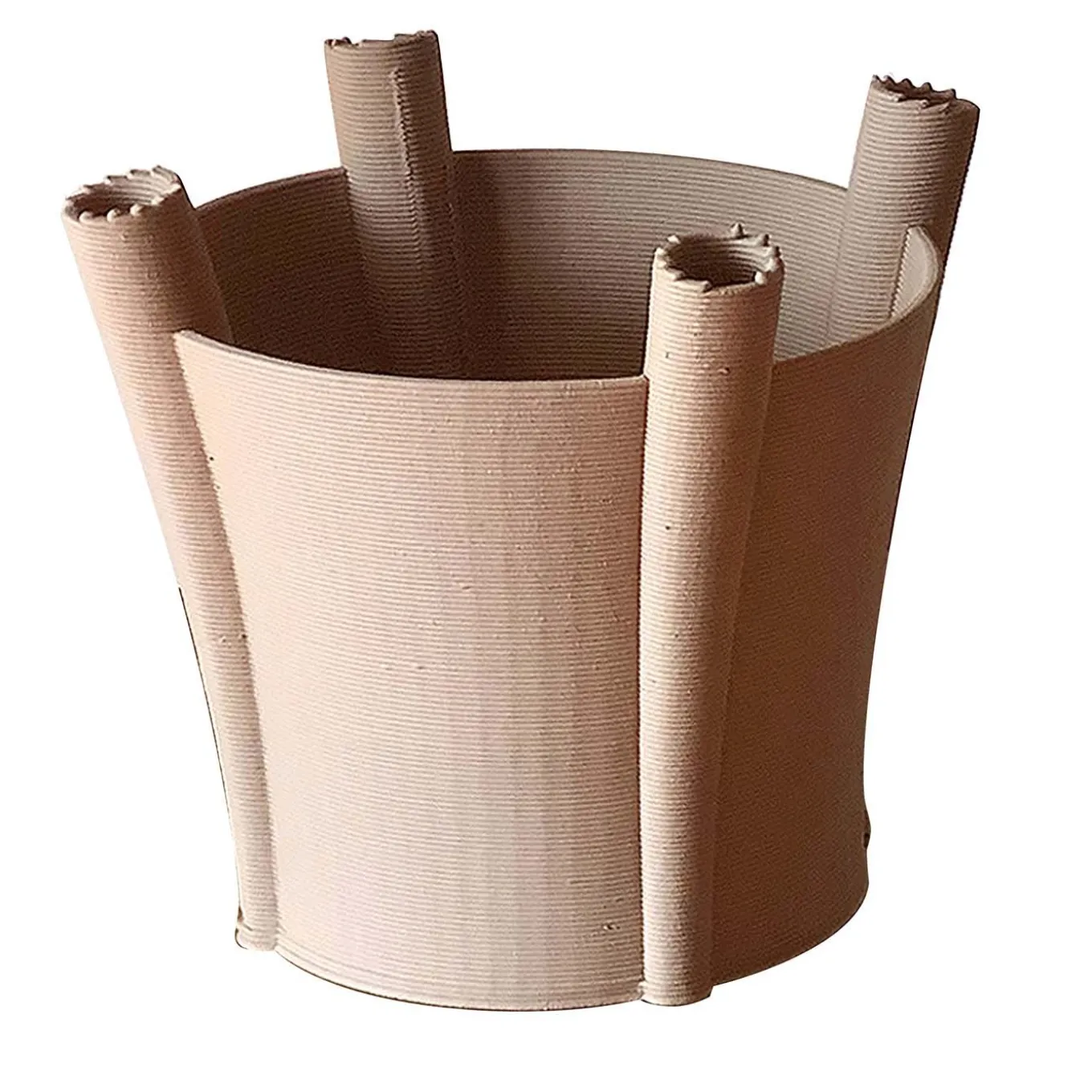 Questo vaso unico vanta un piano aperto e svasato, arricchito ai quattro angoli da quattro elementi tubolari. Realizzato con la nuova tecnologia di stampa 3D, questo vaso in argilla ha una finitura a pori aperti che ne esalta l’aspetto rustico e presenta un recipiente per l’acqua attivato dalla porosità del materiale.