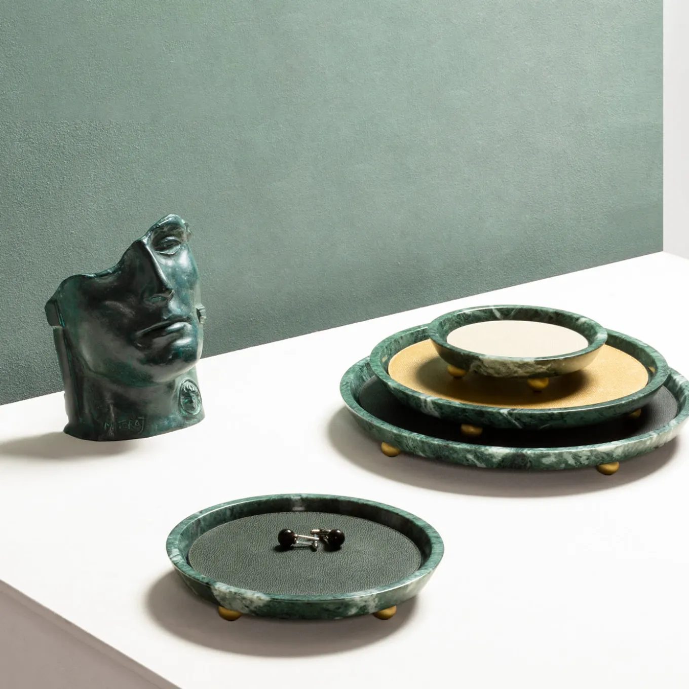 Struttura in marmo con piedi arrotondati in metallo disponibili in diverse finiture. Fornito con tovaglietta in pelle rimovibile. Finiture del marmo disponibili: Arabescato bianco / verde Guatemala / Eramosa marrone / nero Portoro / Travertino. Finiture in metallo disponibili: cromo / bronzo / ottone.