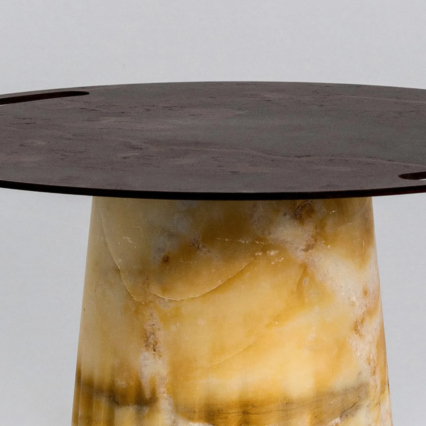 Questo superbo vassoio alto poggia su un cono di marmo giallo di Siena cesellato a mano. Il piano è in ferro trattato con acido e tagliato al laser. Il risultato è un oggetto elegante che ricorda una colonna, elemento presente nelle nostre civiltà fin dalle origini.