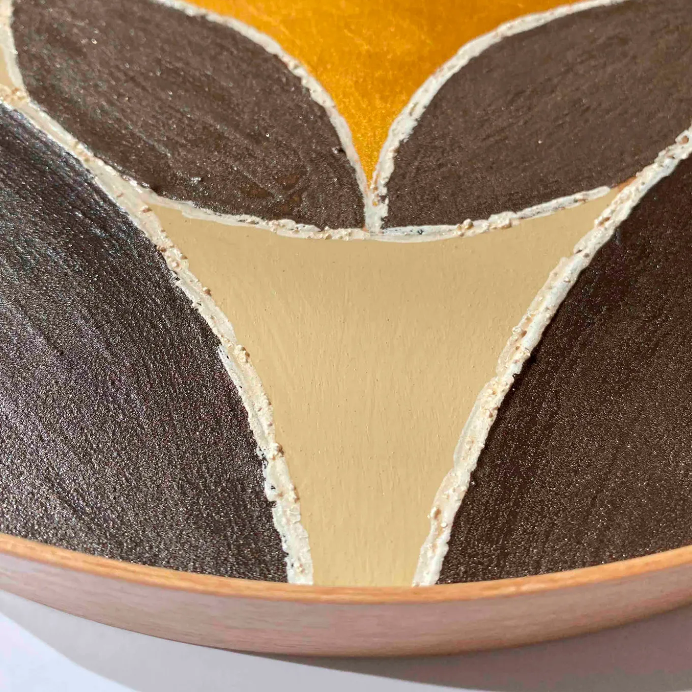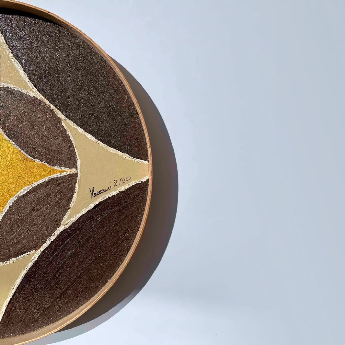 Regalato per l’inaugurazione di una casa o inserito in una collezione personale, questo vassoio rotondo presenta un’affascinante combinazione di forme e colori in un dinamico motivo geometrico con semicerchi sovrapposti di colore grigio, crema e ocra. Realizzato a mano in legno di noce, il disegno è dipinto a mano con colori atossici a base d’acqua e rifinito con un rivestimento protettivo antigraffio. Da esibire come centrotavola o da usare come vassoio da portata per occasioni speciali, questo vassoio versatile è un’aggiunta di grande effetto a una collezione di decorazioni per la casa.