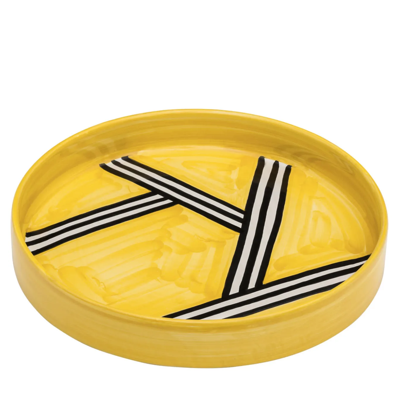 Questo suggestivo vassoio in ceramica è decorato con un impressionante motivo geometrico di linee parallele e perpendicolari bianche e nere su un vivace sfondo giallo.