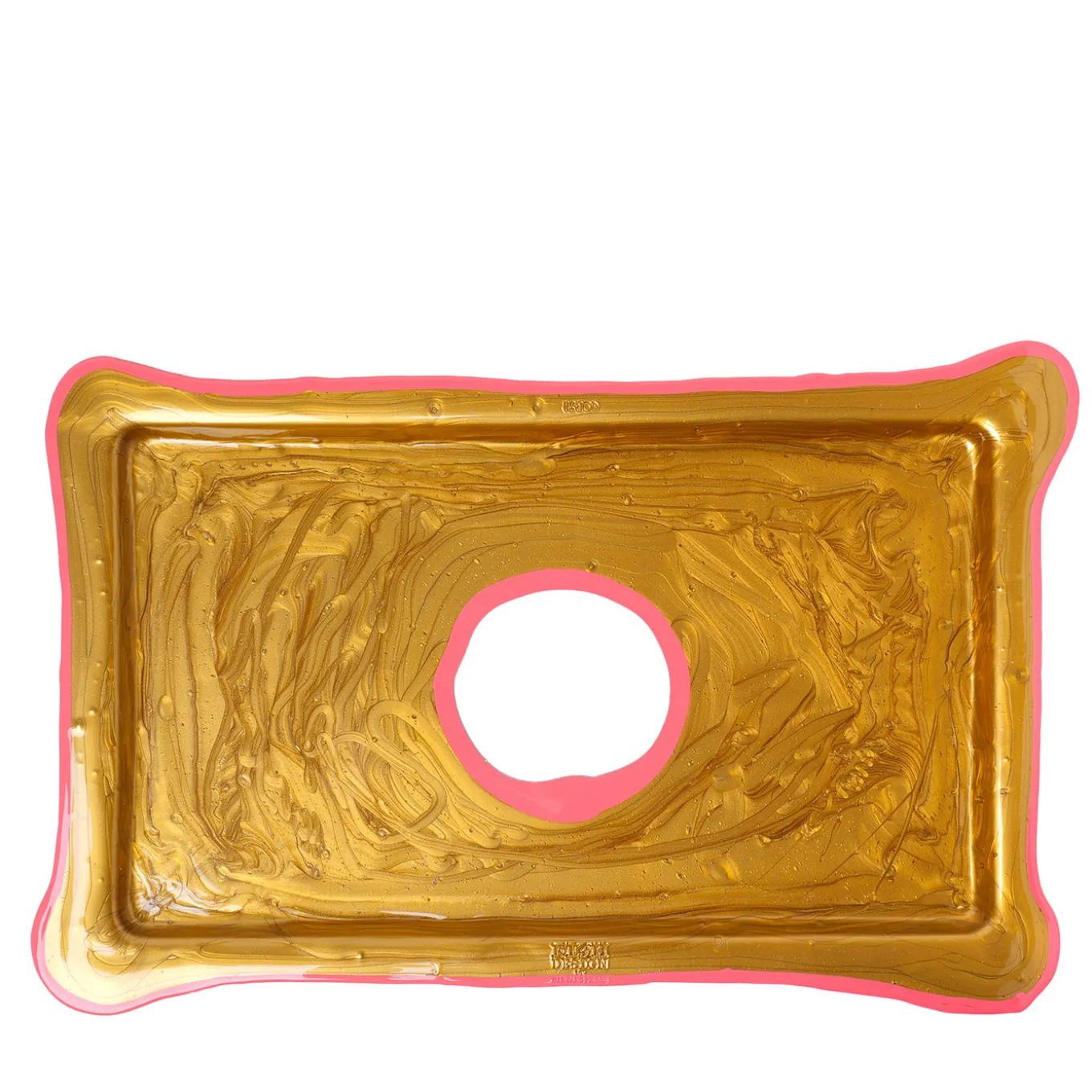 Questo grande vassoio rettangolare di Gaetano Pesce della collezione Fish Design presenta una superficie dorata sorprendente abbinata a un bordo di salmone scuro. Realizzato in resina durevole, offre una finitura fluida e testurizzata. La sua audace combinazione di colori e la sua forma scultorea portano un tocco contemporaneo e artistico sulla tavola o nelle impostazioni di servizio.