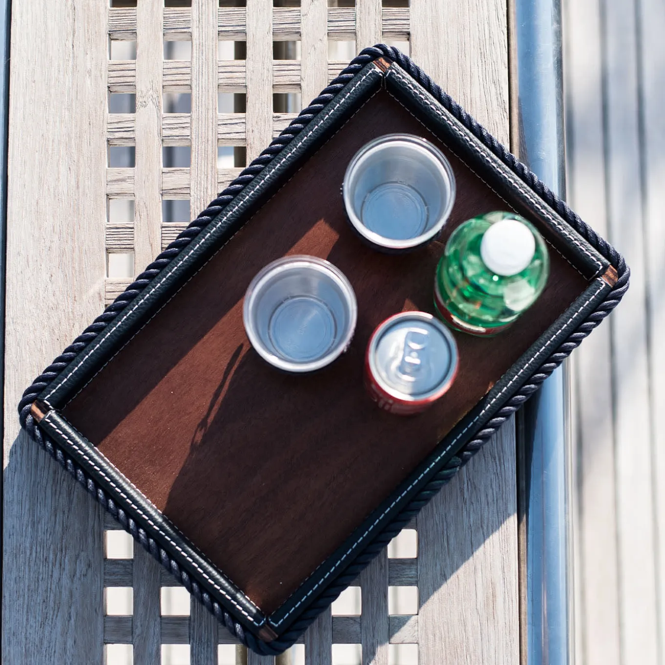 Progettato pensando a un tuffo in mare da una barca, questo vassoio rettangolare sfoggia un design tanto silenzioso nella sua forma quanto eloquente nei suoi ornamenti. L’ecopelle blu che ricopre i lati consente una presa ottimale e dichiara la sua esclusività, mentre le molteplici file di corde coordinate che abbracciano la sua silhouette rivelano inequivocabilmente la sua personalità nautica.