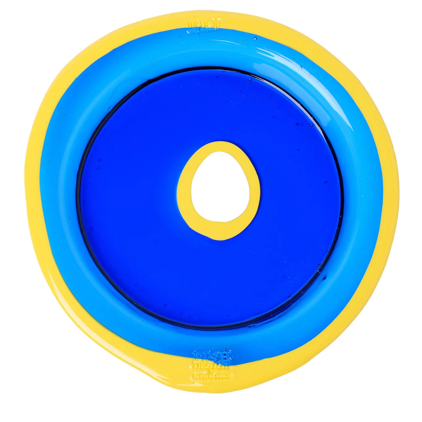 Un grande vassoio rotondo progettato da Gaetano Pesce, parte della collezione Fish Design del 1998. Caratterizzato da un centro blu vibrante con un anello esterno giallo pastello opaco, questo vassoio combina contrasti di colori contemporanei con una finitura liscia in resina. Il suo design distintivo e la costruzione resistente lo rendono adatto per servire o come un accento da tavolo notevole.
