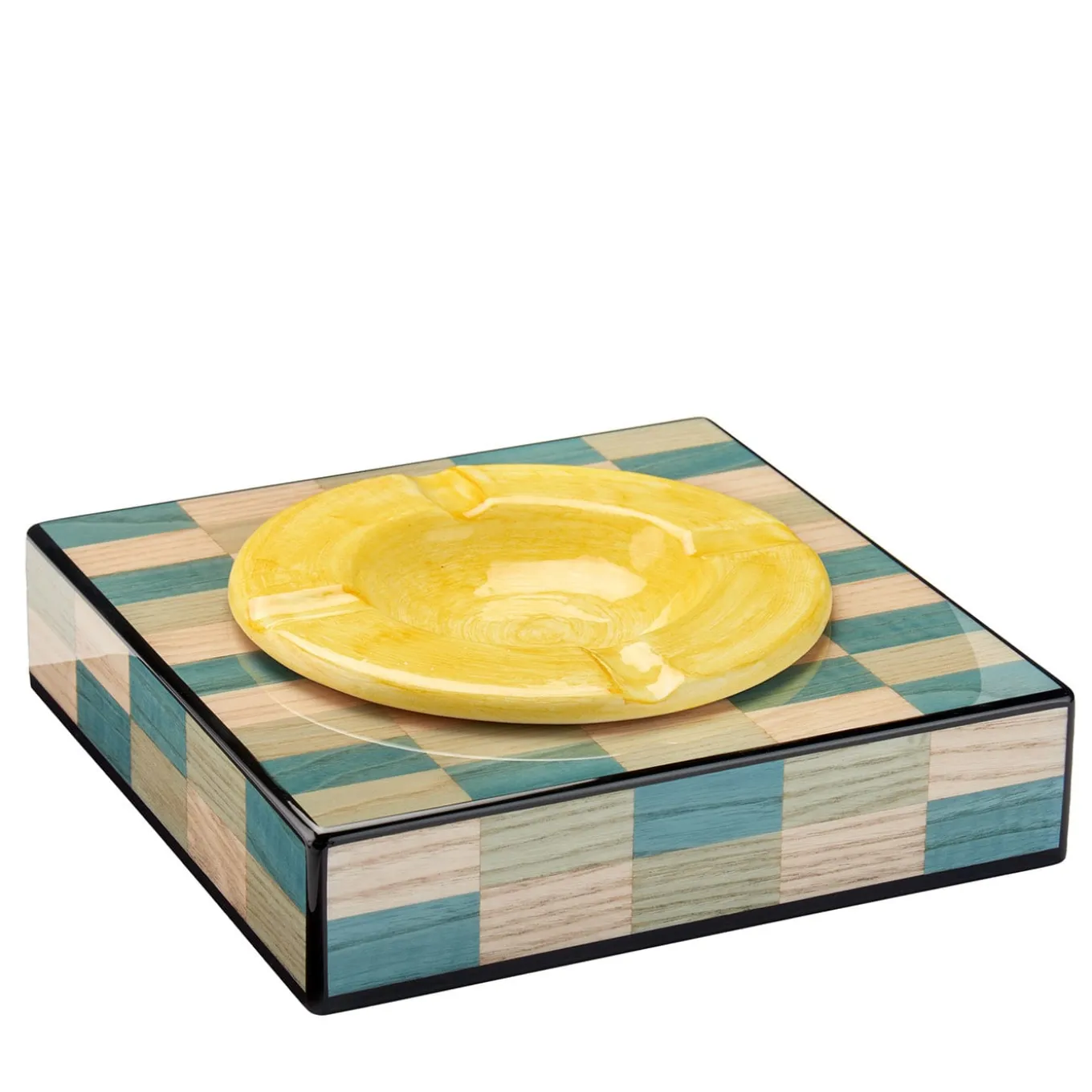 Trasformando magistralmente un oggetto di uso quotidiano in un raffinato pezzo di interior design, questo posacenere è una sublime dimostrazione di artigianalità. Presenta venature e venature naturali attraverso le finiture lucide e spazzolate a specchio delle superfici in legno e ceramica, ed è decorato a mano con un intarsio dipinto in delicate tonalità che ricordano la laguna di Venezia. Disponibile in altri colori, consultare il catalogo Artemest per le opzioni.