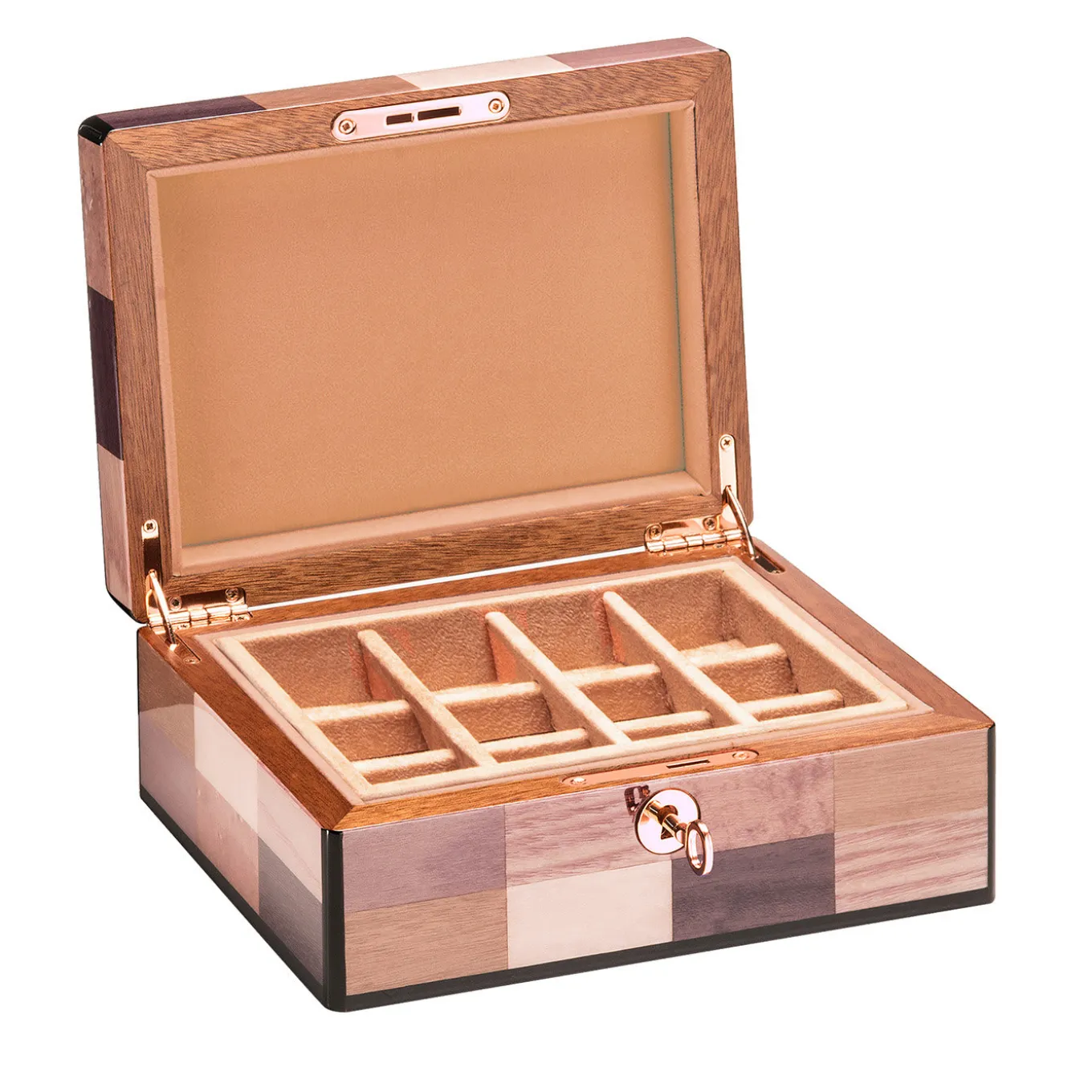Eleganza e funzionalità si fondono senza sforzo in questo splendido portagioie, composto da un vassoio rimovibile con 12 scomparti ideali per riporre orecchini e gemelli. Prezioso oggetto d’arte, è realizzato in mogano arricchito da un intarsio di rettangoli rosa pastello, marroni e beige, che si abbinano perfettamente alla tappezzeria in Alcantara beige che riveste l’interno. Completato da dettagli in metallo con finitura oro rosa, tra cui una piccola e raffinata chiave.