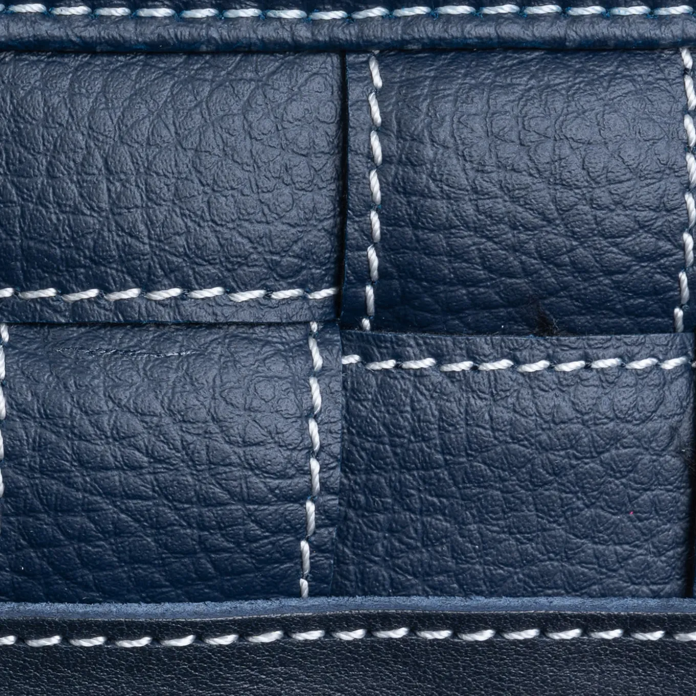 Perfetto complemento per interni raffinati in tonalità navy, questo vide-poche esemplifica l’eleganza sartoriale con il suo intrigante disegno reticolare ottenuto annodando fasce di ecopelle blu. Raccogliere chiavi, monete o conservare l’essenziale per la notte sono solo alcuni degli usi che suggerisce con il suo design compatto e funzionale, completato da un fondo rigido. Le cuciture a contrasto sottolineano la consistenza di questo pezzo esclusivo, disponibile anche in diverse varianti di colore e dimensioni.